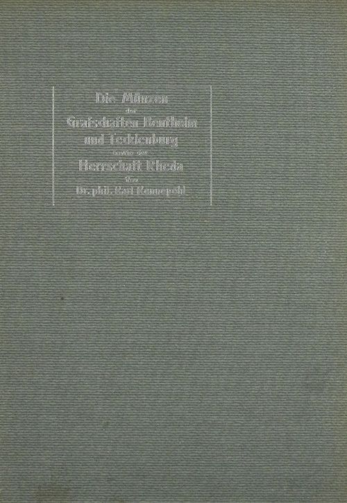 Kennepohl, Karl. DIE MÜNZEN DER GRAFSCHAFTEN BENTHEIM UND TECKLENBURG SOWIE DER HERRSCHAFT RHEDA. Frankfurt am Main, 1927. Small 4to, original blue-gray cloth lettered in silver. 77, (3) pages; map; 5 fine plates. Fine. The primary work. Scarce. Clain-Stefanelli 9256.