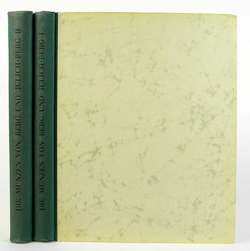 Noss, Alfred. DIE MÜNZEN VON BERG UND JÜLICH-BERG. München, 1929. Two volumes. 4to, later matching green cloth-backed boards, lettered in black. xv, 298; xv, 332 pages; 2 maps; genealogical tables; 17 + 22 fine plates. Previous owner's stamp to front pastedowns, else fine. The indispensable standard work. Scarce. Clain-Stefanelli 9257*.