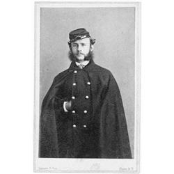 "A great CDV,. a full standing pose of Lieutenant Frederick James, 3rd United States Cavalry wearing a winter overcoat. James was a West Point graduate who served with the 3rd U. S. Cavalry in the Western theater until he was accidentally killed August, 1864. Back stamp by Gurney and Son, New York. Minor stains, else very good." 2429 A great CDV,. a full standing pose of Lieutenant Frederick James, 3rd United States Cavalry wearing a winter overcoat. James was a West Point graduate who served with the 3rd U. S. Cavalry in the Western theater until he was accidentally killed August, 1864. Back stamp by Gurney and Son, New York. Minor stains, else very good.