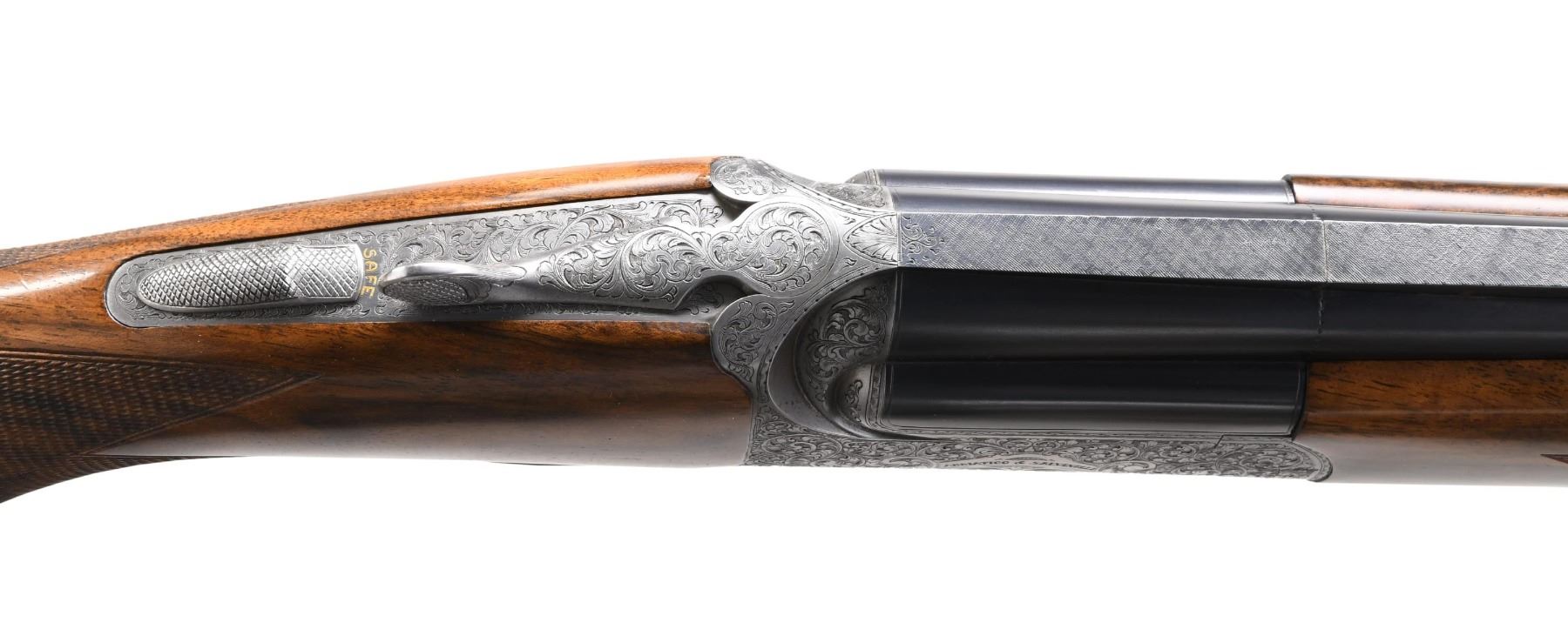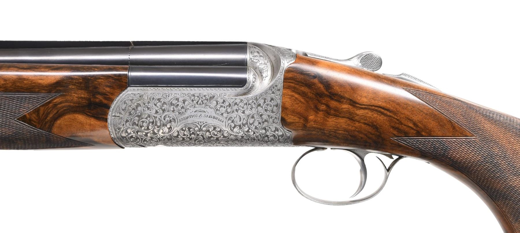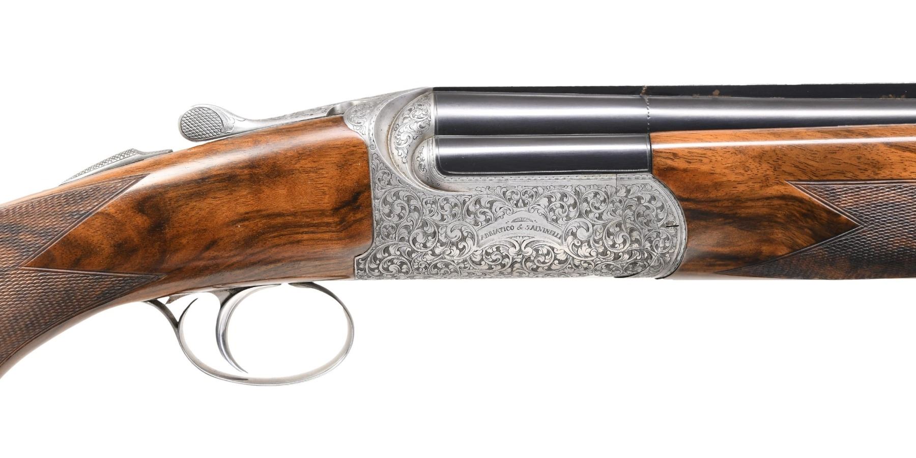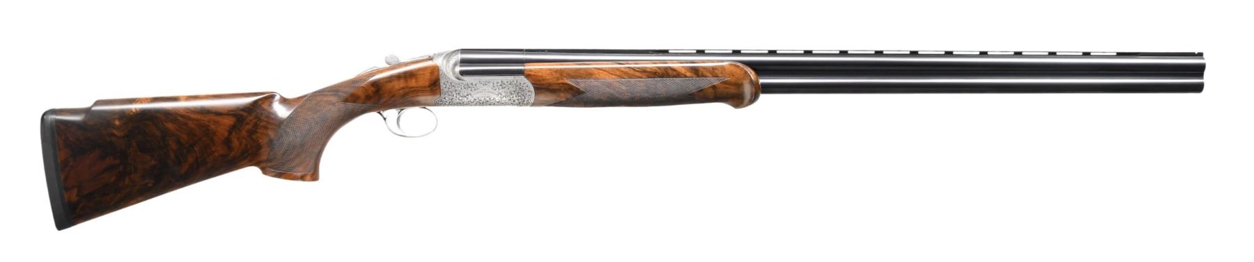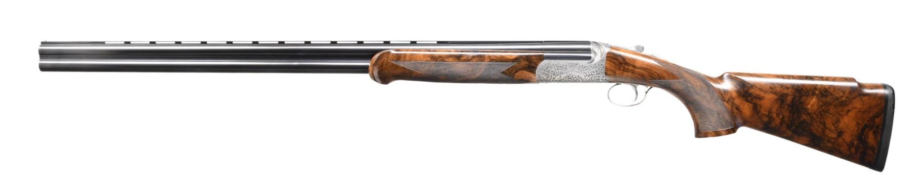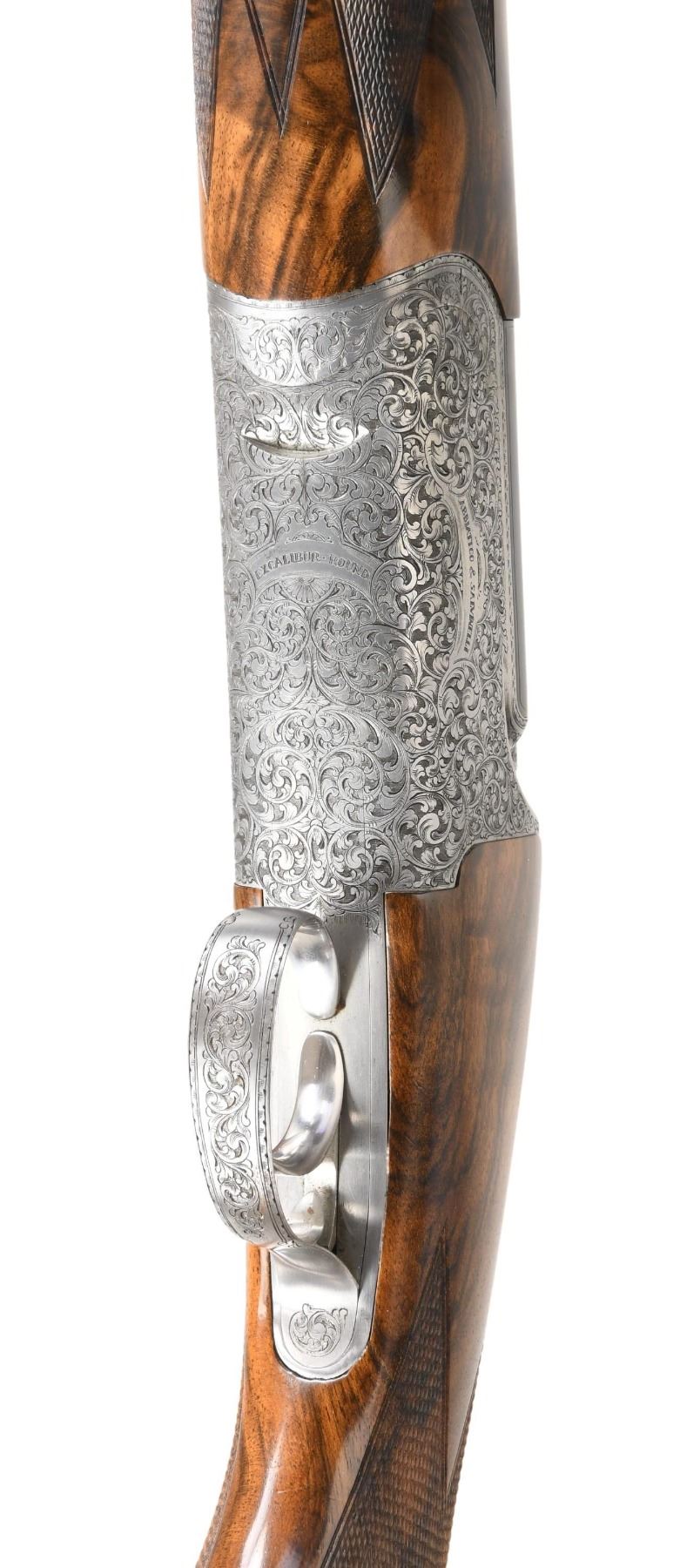 EXCALIBUR-ROUND O/U CLAYS GUN. Cal. 12 Ga. 2-3/4". S# F0397. This desirable gun has 31" monobloc barrels with slightly raised matted and ventilated rib. Maker's name is engraved on left side of top barrel, bottom of monobloc is stamped with 2003 Italian nitro proofs for 2-3/4" chambers. Barrels are fitted with interchangeable choke tubes. Coin finished round bodied low profile O/U action is fitted with removable single trigger/firing group with non-automatic safety and non-selective trigger. Action is engraved with near full coverage of well cut and shaded varying size open scroll which surrounds maker's name in arched devices on each side. Bottom is engraved "EXCALIBUR - ROUND". Engraver's signature "D. BONSI" is on trigger group housing. Extreme pistol grip buttstock made of a piece of very attractive stump figured and beautifully marbled European walnut measures 14-3/4" over black decelerator clays pad. Stock features low Monte Carlo comb and closely spaced point pattern checkering on grip with right hand palm swell. Matching schnabled one piece forend has Anson type release with release button at center resembling a Deeley type latch. MEASUREMENTS: BBLS: Bore Diameter: O .723. U .723. Restriction: O IC tube. U IC tube. Wall thickness: O .036. U .033. STOCK: DAH: 2-3/8". Rear of Monte Carlo 2". DAC: 1-3/4". CAST: about 1/2" off. LOP: 14-3/4". WEIGHT: 8 lb. 0 oz. CONDITION: very fine showing evidence of moderate use but no abuse. Metal parts retain nearly all of their original finishes without any noted spots of wear or darkening. Stocks have a minor scattering of light marks. Checkering has slightly darkened. Bores are bright and shiny. Mechanically fine. This very well made gun currently retails at well over $30,000. (24-5143/MGM). MODERN. $14,000-18,000.