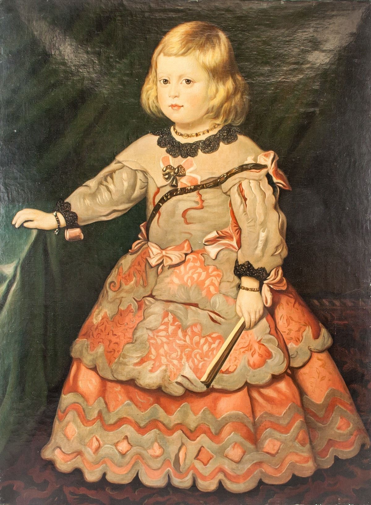 Oil on canvas. Featuring a portrait of girl from the Spanish royal family. Signed and attr. Diego Velazquez (Spanish, 1599-1660) on the lower margin. 80 x 60 cm (31.5 x 23.6 inches). Diego Velazquez was among the most renowned Spanish painters of the 17th century. The artist’s deft description of light and form are hallmarks of his work. “I would rather be the first painter of common things than second in higher art,” he once said. Born Diego Rodríguez de Silva Velázquez on June 6, 1599 in Seville, Spain, he briefly studied under Francisco Herrera the Elder before becoming the apprentice of Francisco Pacheco. Under Pacheco, the young artist learned to emulate the chiaroscuro of Caravaggio. In 1622, he traveled to Madrid with the hope of gaining royal patronage, and was given a chance to paint a portrait of King Philip IV. Praised for the work by the king, Velázquez was appointed court painter, a position he would hold for the rest of his life. It was in the royal household that Velázquez first saw the works of Titian, whose paintings he profoundly admired. In 1628, Velázquez journeyed to Italy for the first time, where he studied the works of Tintoretto, Raphael, and Michelangelo. He would return to Italy later in life, producing several famed paintings, including a portrait of Pope Innocent X and The Toilet of Venus (1647–1651). Velázquez died on August 6, 1660 in Madrid, Spain. Today, the artist’s works are held in the collections of the Metropolitan Museum of Art in New York, the Prado Museum in Madrid, and the National Gallery in London, among others. PROVENANCE: PROVENANCE: Southern Italian estate