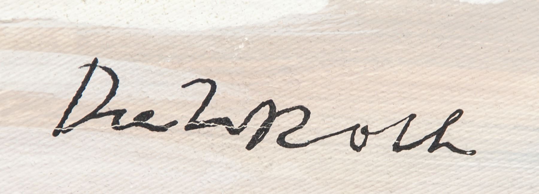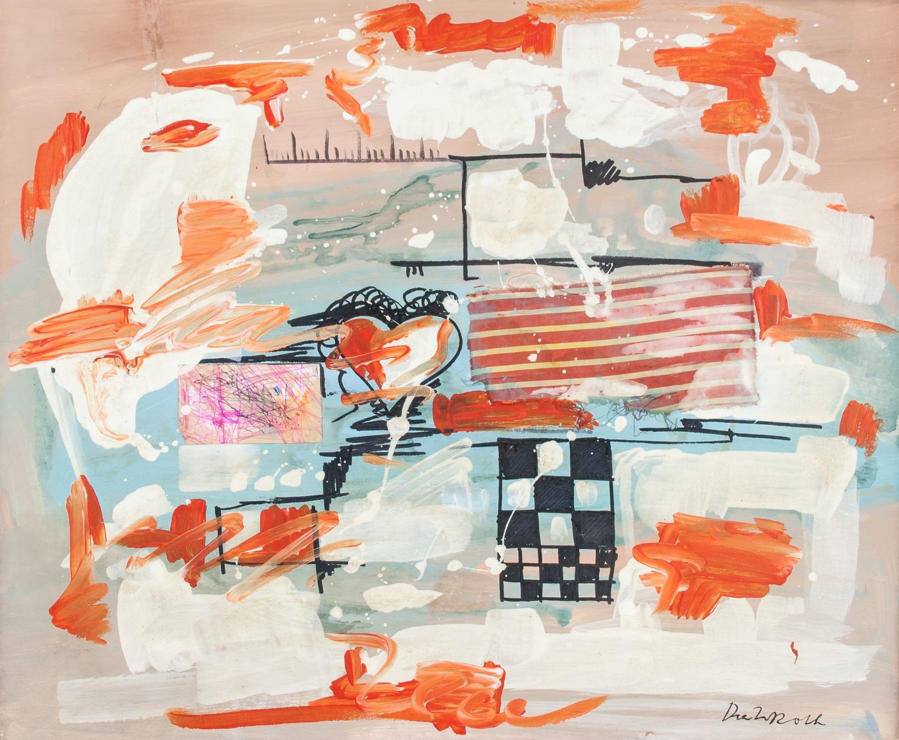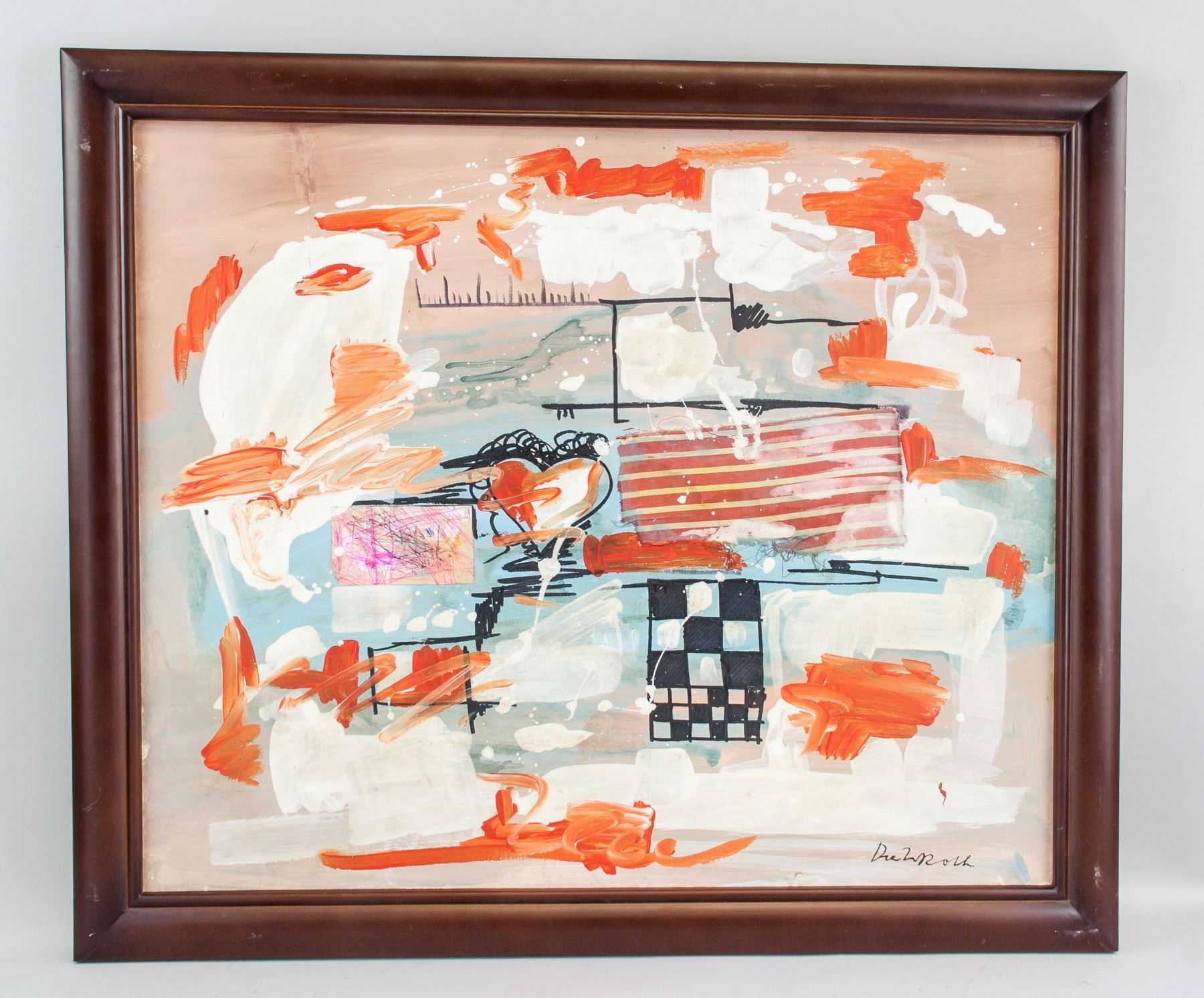 Oil on canvas abstract. Signed and attr. Dieter Roth (German, 1930-1998) lower right corner. 19.7 x 23.6 in. (50 x 60 cm). Considered one of the most influential European artists of the post-war period, Dieter Roth produced artworks in a great range of media, from artist's books, graphics, drawings, and sculptures, to assemblages and installations including sound, music, and video. In 1954 Roth started to make experimental works, including his first baked sculpture (a spiral made from bread dough), forays into Op art, and kinetic sculptures. In the ’60s he made pictures and objects that incorporated chocolate and other edible materials subject to decomposition-meditations on time, decay, and metamorphosis. Critics often note that there was little to separate Roth’s life from his work; his artwork, Fussboden (Floor, 1975-92), for example, was comprised of a wooden studio floor covered with pigment and glue. To create the work, Roth removed the floor from his studio in Iceland and hung it like a painting, allowing it to function as a ready-made record of his practice. PROVENANCE: Southern Ontario estate