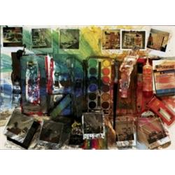 Polaroid photographs, acrylic, gouache, various cardboard containers, used paint tubes, watercolor paint cakes, plastic container, flash bulb, discarded plastic Polaroid film cartridge and metal jar lid affixed to paper board