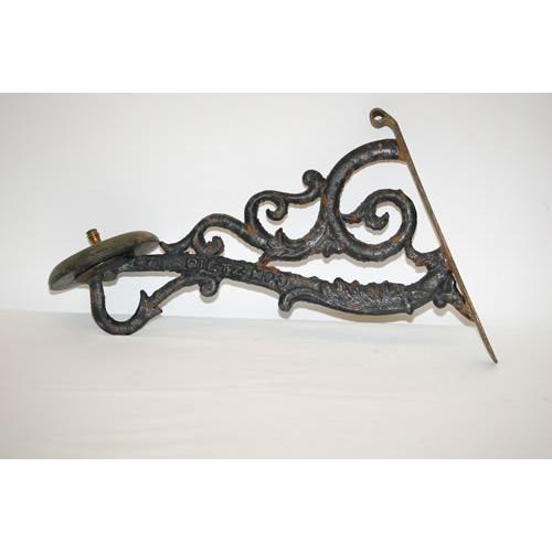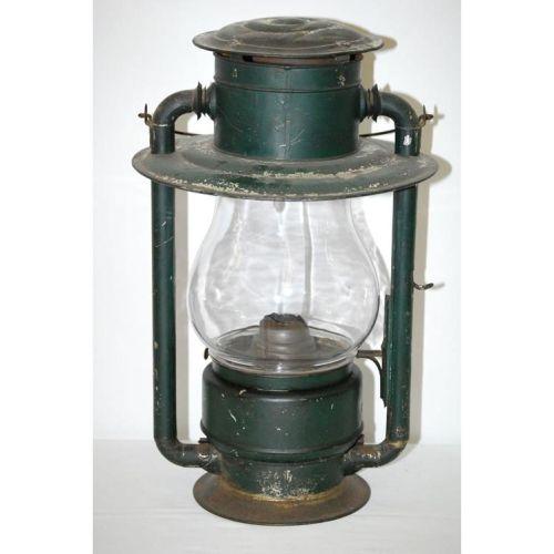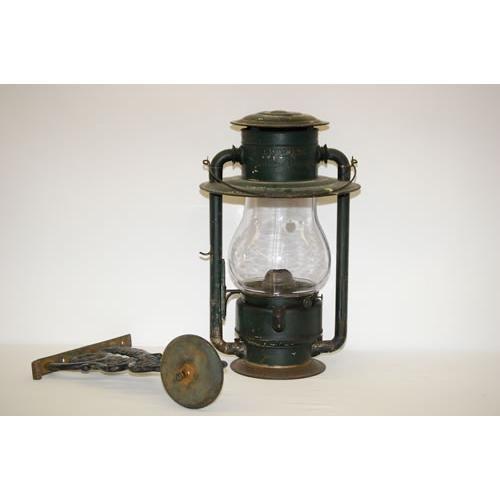 DIETZ #3 STREET BRACKET LAMP-GREEN PAINTED TIN W/ BAIL HANDLE, CLEAR GLOBE & TIN BURNER W/ A BLACK PAINTED WROUGHT IRON MOUNTING BRACKET, BOTH SIGNED DIETZ (LANTERN-21" T X 12" W; BRACKET-13" T X 18" W) - WEAR, LOSSES, IMPERFECTIONS