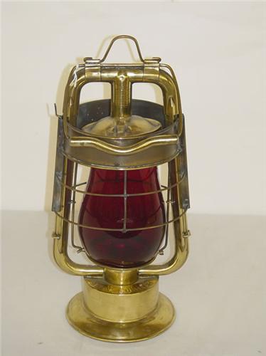 DIETZ BRASS FIRE KING LANTERN W/ SLIDE OFF CAGE & RED GLOBE - MINOR DAMAGE TO TOP OF CAGE, WEAR;