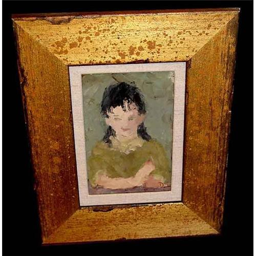 DIETZ EDZARD (German, 1893-1963) Portrait of a little Girl. Oil on canvas laid on board, signed lower right, housed in a wonderful gilt wood frame, with linen liner. Affixed to the verso is the original Dietz Edzard Atelier label titling and dating the piece. Edzard is best known for his detailed paintings of genre, portraits, Venice, cafes, coasts, still life?s, flowers, dancers, and nudes. Measuring 4.5 x 6.75 inches (painting), 8.5 x 10.5 inches (frame). CONDITION: Very good to excellent.