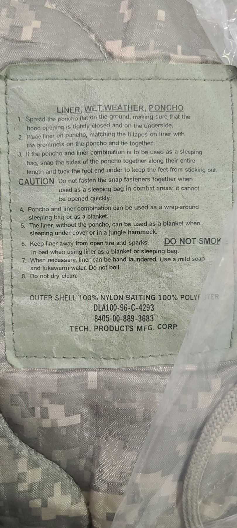 DIGITAL ARMY COMBAT CAMOUFLAGE LINER - WET WEATHER PONCHO FOR SLEEPING BAG
