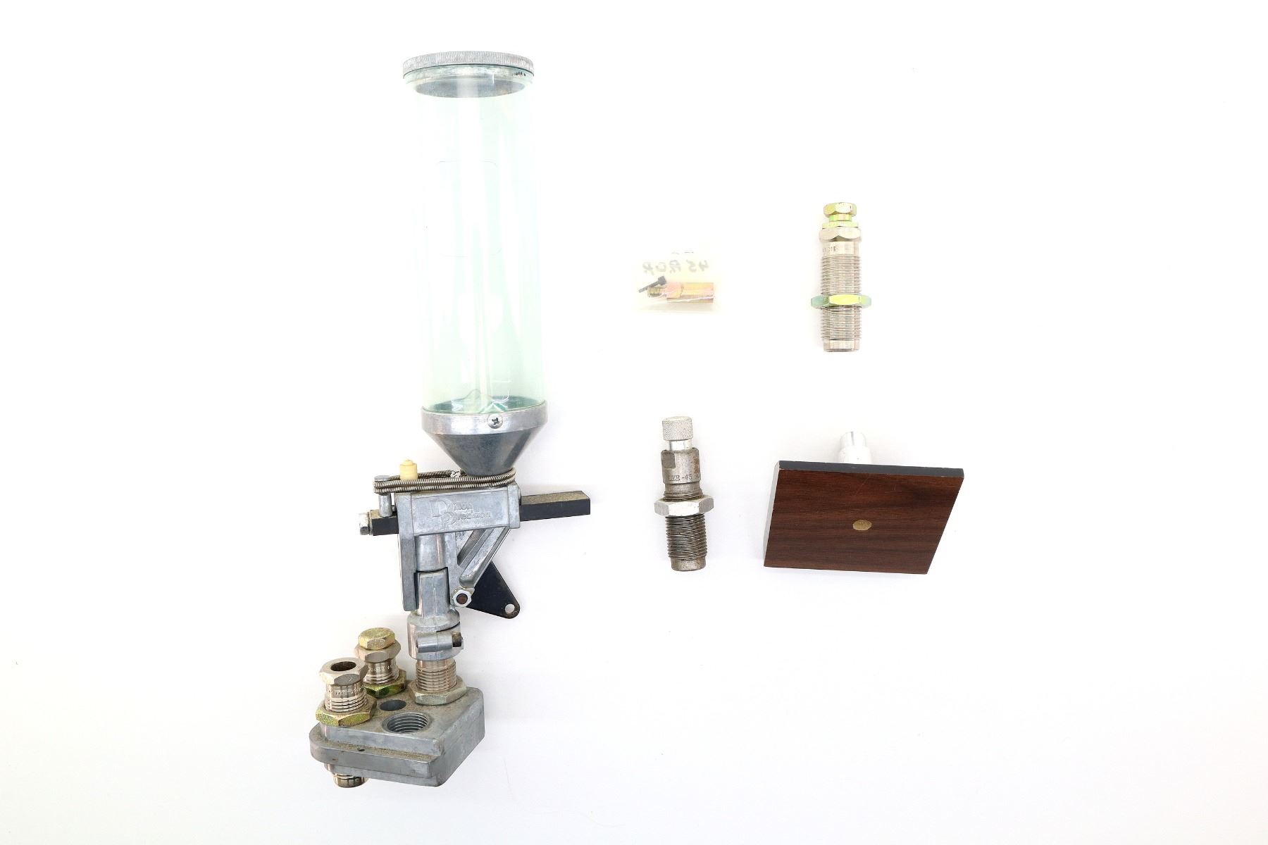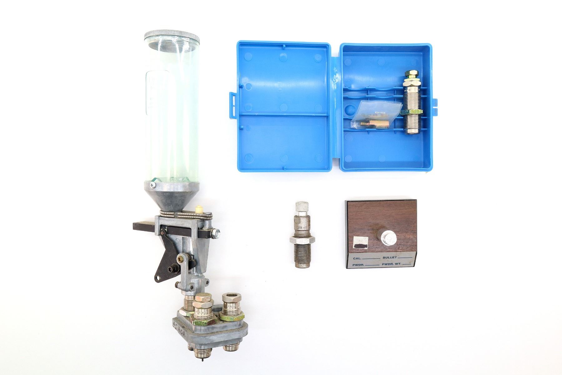 LOT INCLUDES; (1) DILLON 650 POWDER MEASURE, (1) 4-PIECE .45 ACP RELOADING DIES ATTACHED, (1) DILLON 650 4-HOLE TOOL HEAD, (1) DILLON 650 TOOL HEAD BASE & (1) 1-PIECE RELOADING DIE. SEE PHOTOS.