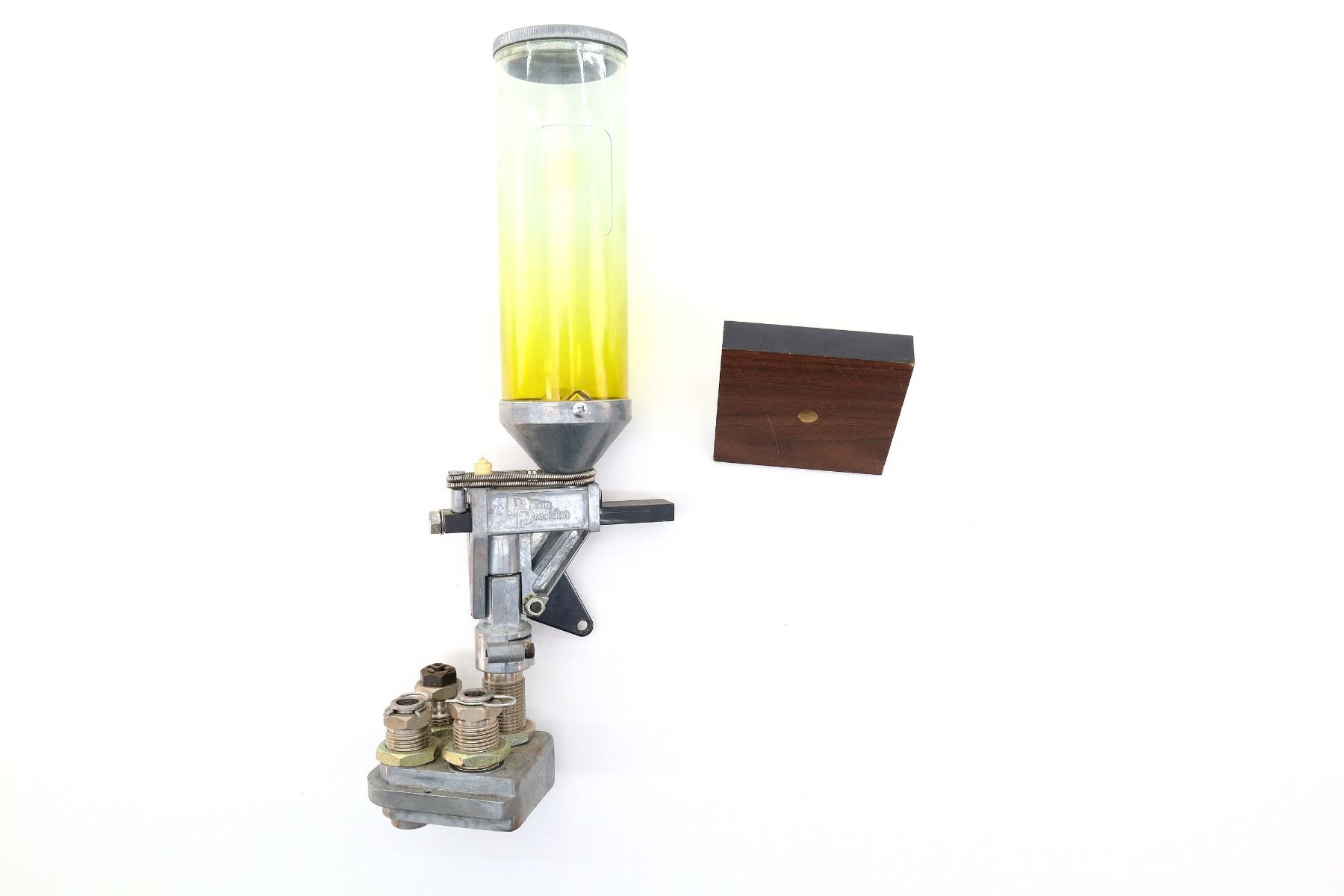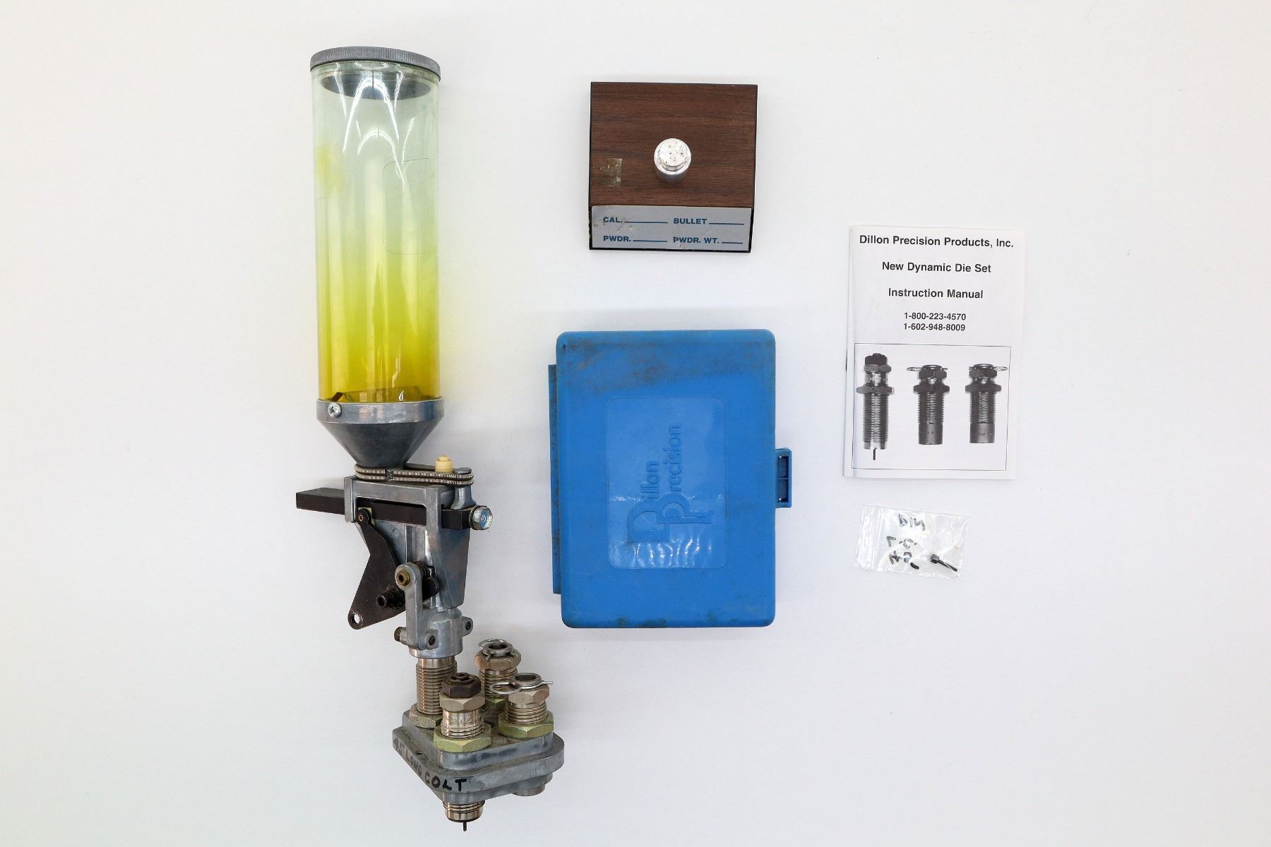 LOT INCLUDES; (1) DILLON 650 POWDER MEASURE, (1) 4-PIECE .45 ACP RELOADING DIES ATTACHED, (1) DILLON 650 4-HOLE TOOL HEAD & (1) DILLON 650 TOOL HEAD BASE. SEE PHOTOS.
