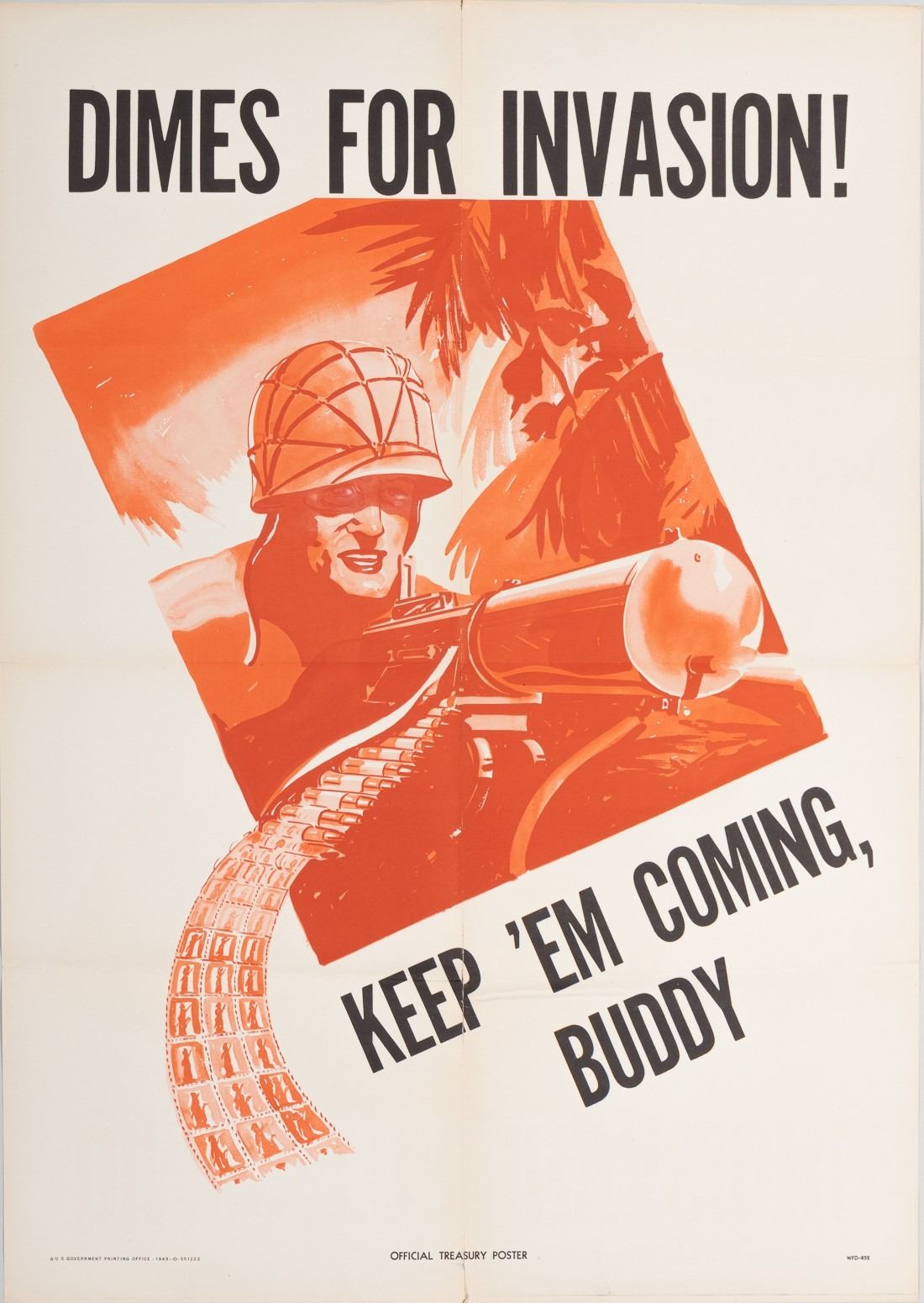 American WWII poster 'Dimes for Invasion! Keep 'Em Coming, Buddy'. U.S. Treasury poster, 1943, 28 x 20 inches. Mounted to card board.