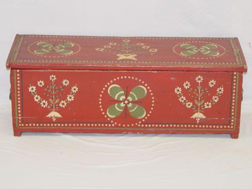 DIMINUTIVE 19TH CENT. PINE SAILORS CHEST W/ LATER FOLK ART PAINTED FLORAL & GEOMETRIC DECORATIONS IN RED, GREEN, BLACK & WHITE W/ BECKET HANDLES & BREADBOARD END TOP, MARKED ROGERS/HARWICH (10 3/4"T X 33"W X 12 3/4"D) - PAINT WEAR, IMPERFECTIONS