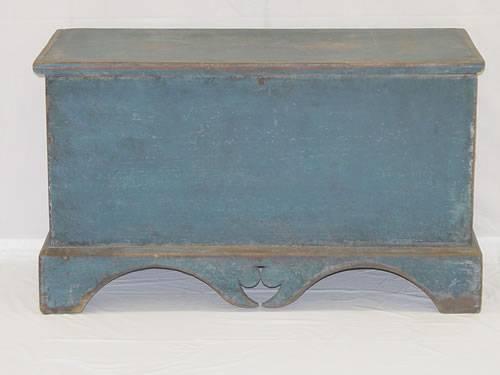 DIMINUTIVE DOVETAILED LOW BLANKET CHEST W/ BRACKET BASE and SHAPED SKIRT IN OLD BLUE PAINT - IMPERFECTIONS, REPAIR TO BACK FOOT;