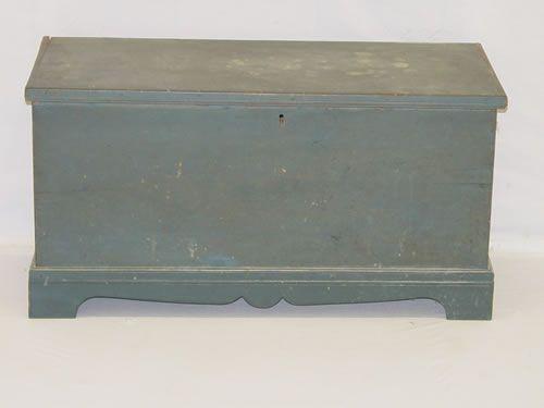 DIMINUTIVE NEW ENGLAND 19TH CENT. PINE LOW BLANKET CHEST IN BLUE PAINT W/ CUT-OUT ENDS & SCALLOPED BASE (17" T X 33" W X 15 1/2" D) - LID DETACHED WITHOUT HINGES, WEAR TO PAINT, IMPERFECTIONS