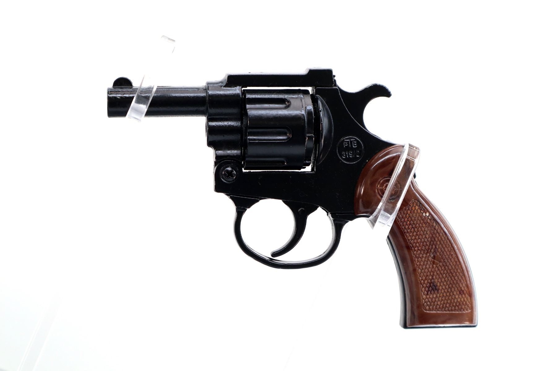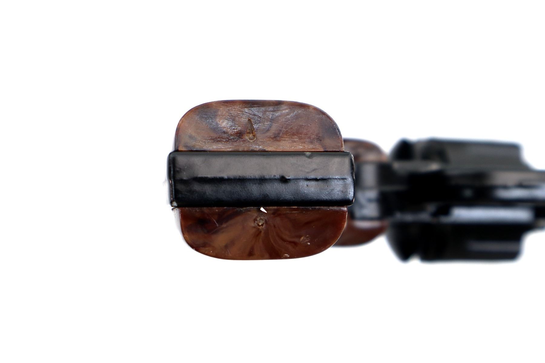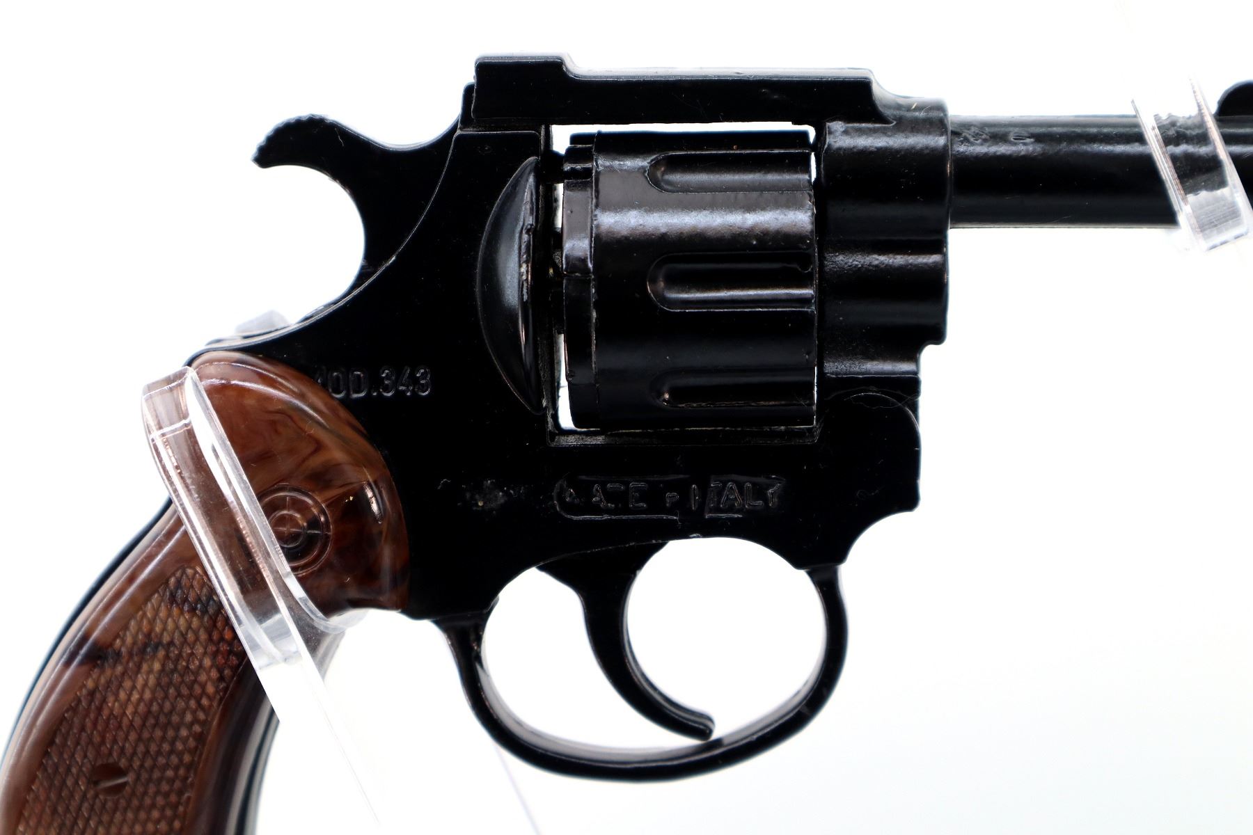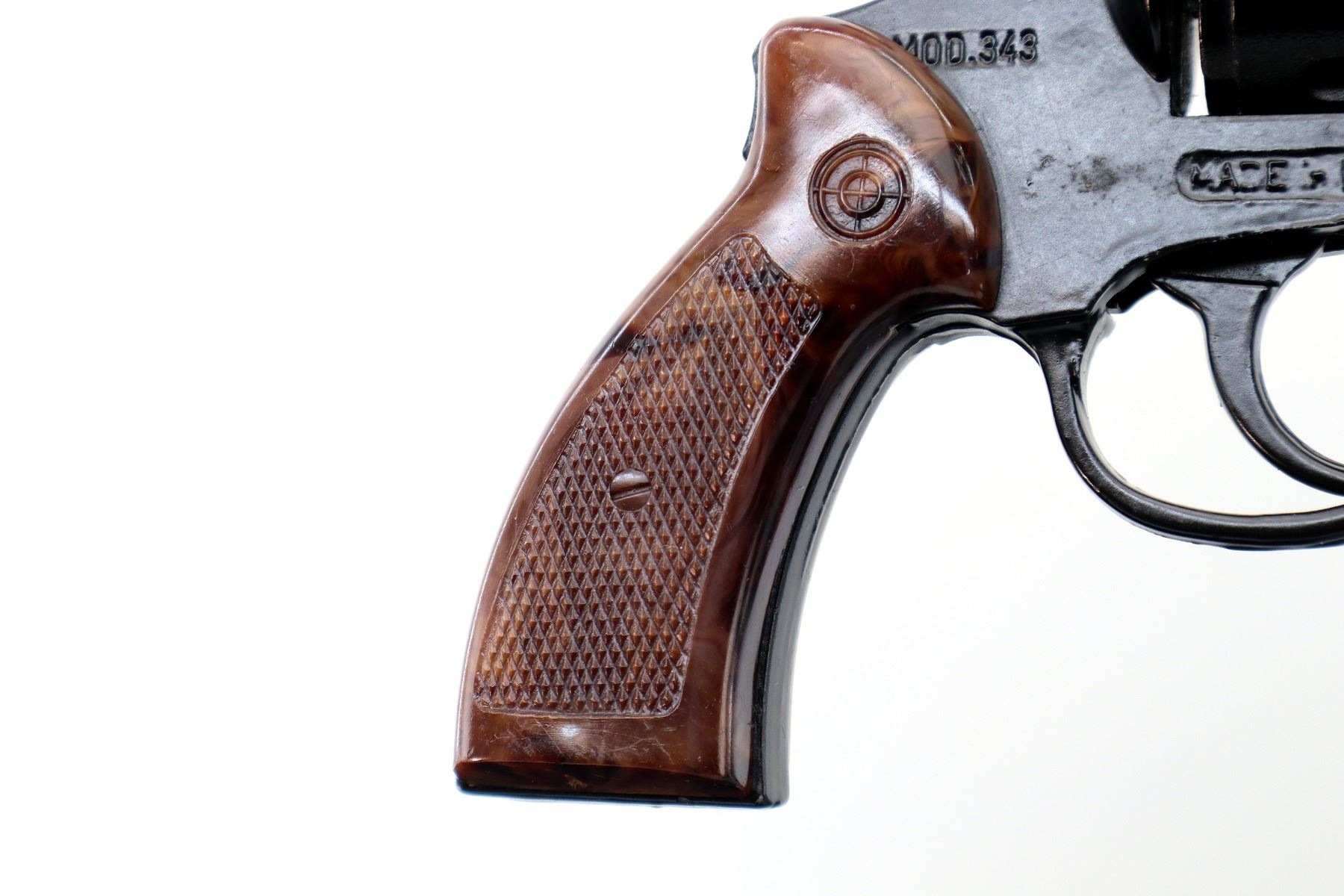 Main Description: This blank revolver is missing the cylinder access pin does not function. Blade front sight, black painted alloy construction, grooved spur hammer. Two piece checkered brown polymer grips.