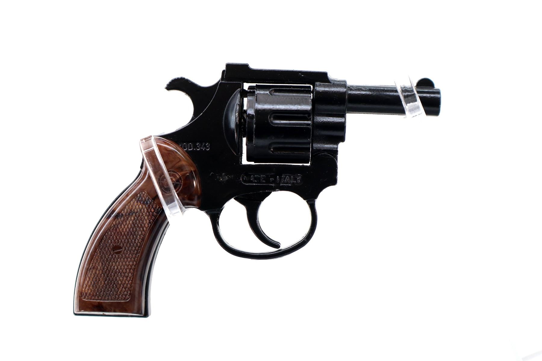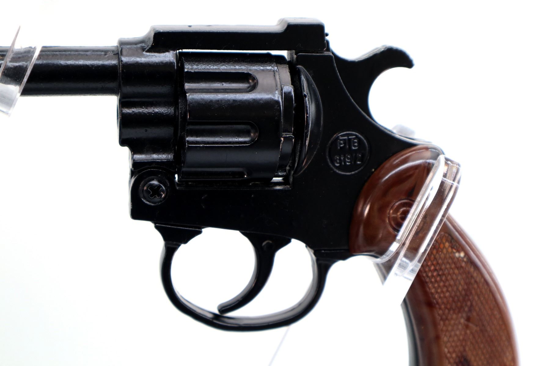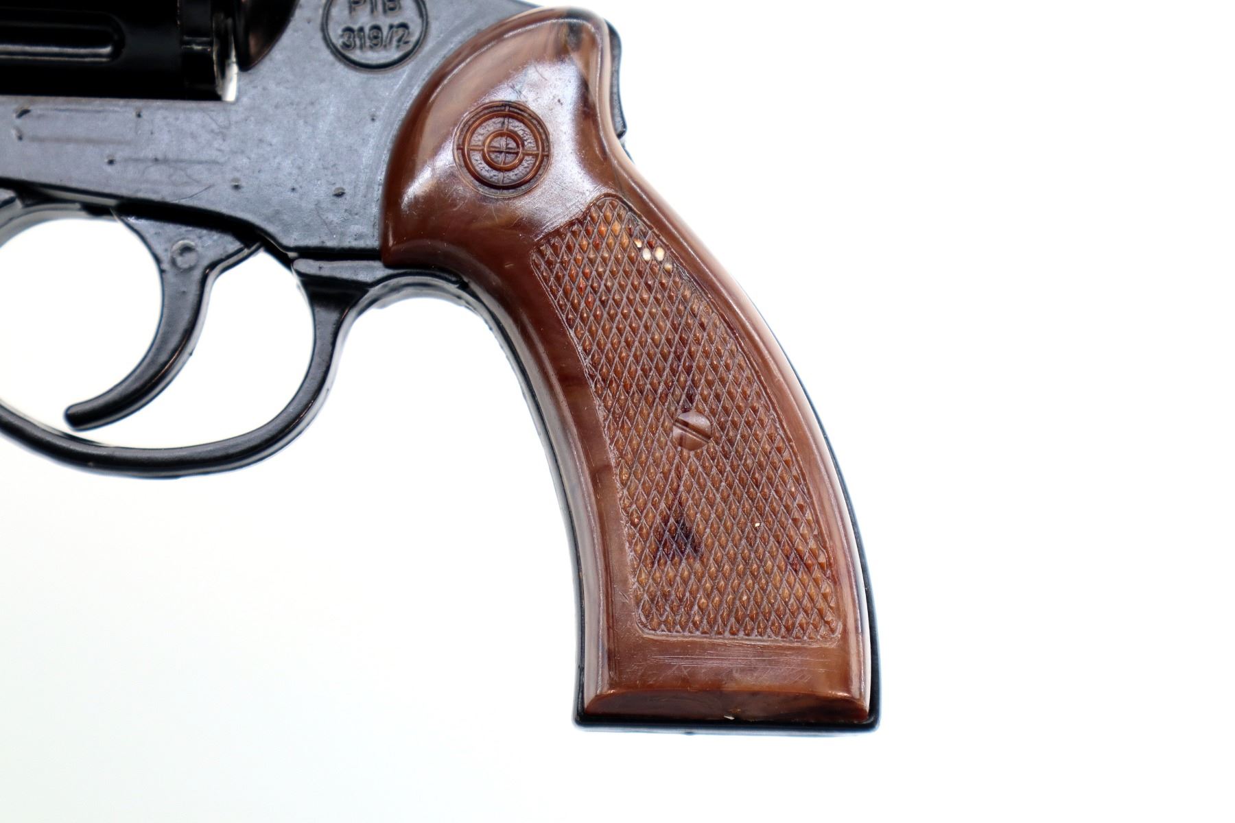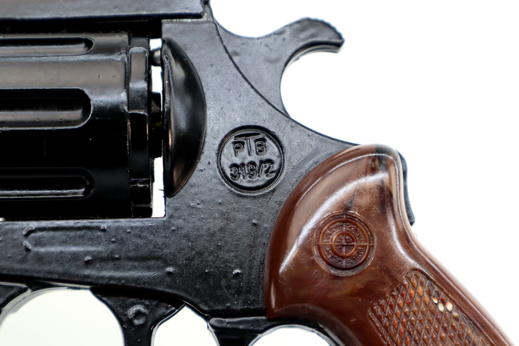 Main Description: This blank revolver is missing the cylinder access pin does not function. Blade front sight, black painted alloy construction, grooved spur hammer. Two piece checkered brown polymer grips.