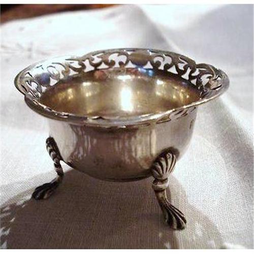 LOVELY ANTIQUE STERLING SILVER CONDIMENT DISH,MADE BY DINGWALL ENGLISH GOLDSMITHS AND FULLY HALLMARKED AND SIGNED - AS PER IMAGES - IT IS SUCH A GEM, WITH INTRICATE,OPEN WORK, STANDING ON 3 LOVELY FIGURAL FEET - Excellent condition free of dents, rust or cracks, It stands about 1 1/2" high and about 2 1/2" in diam., US Buyer to pay 7.00 plus insurance.THANKS.