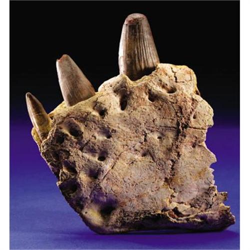 <B>DINOSAUR BOTTOM JAW END PIECE</B></I><BR> <I>Spinosaur aegypticus<BR>Cretaceous, Albian stage<BR>Kem-Kem Basin, South of Taouz, K'Sar es Souk Province, Morocco</B></I><BR>It is generally accepted that the Spinosaurus was the largest of all carnivores. They are immediately familiar from the sail-like structure formed by extensions from their vertebrae. Whether these protrusions were covered with muscle or simply skin is a matter of some debate. This is the tip of the lower jaw and boasts three good teeth; on the jaw itself one can still see the holes where veins and arteries went through the bone. It measures 6 x 7½ x 2¼ inches.<BR><BR><b>Shipping:</b> Requires 3rd Party Shipping (<a target="_blank" href="http://www.heritageauctions.com/common/shipping.php">view shipping information</a>)
