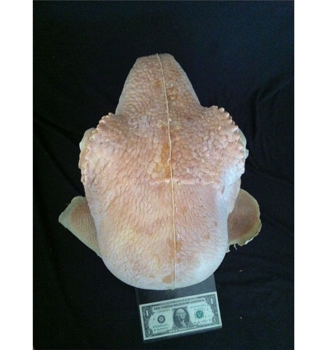 This is an incredibly cool raptor dinosaur full head unused mask made of heavy latex. Some sort of test pull for an animatronic puppet skin. Excellent one of a kind pull to finish up yourself for display, use for a costume, or use in your Haunt or Indy Film!