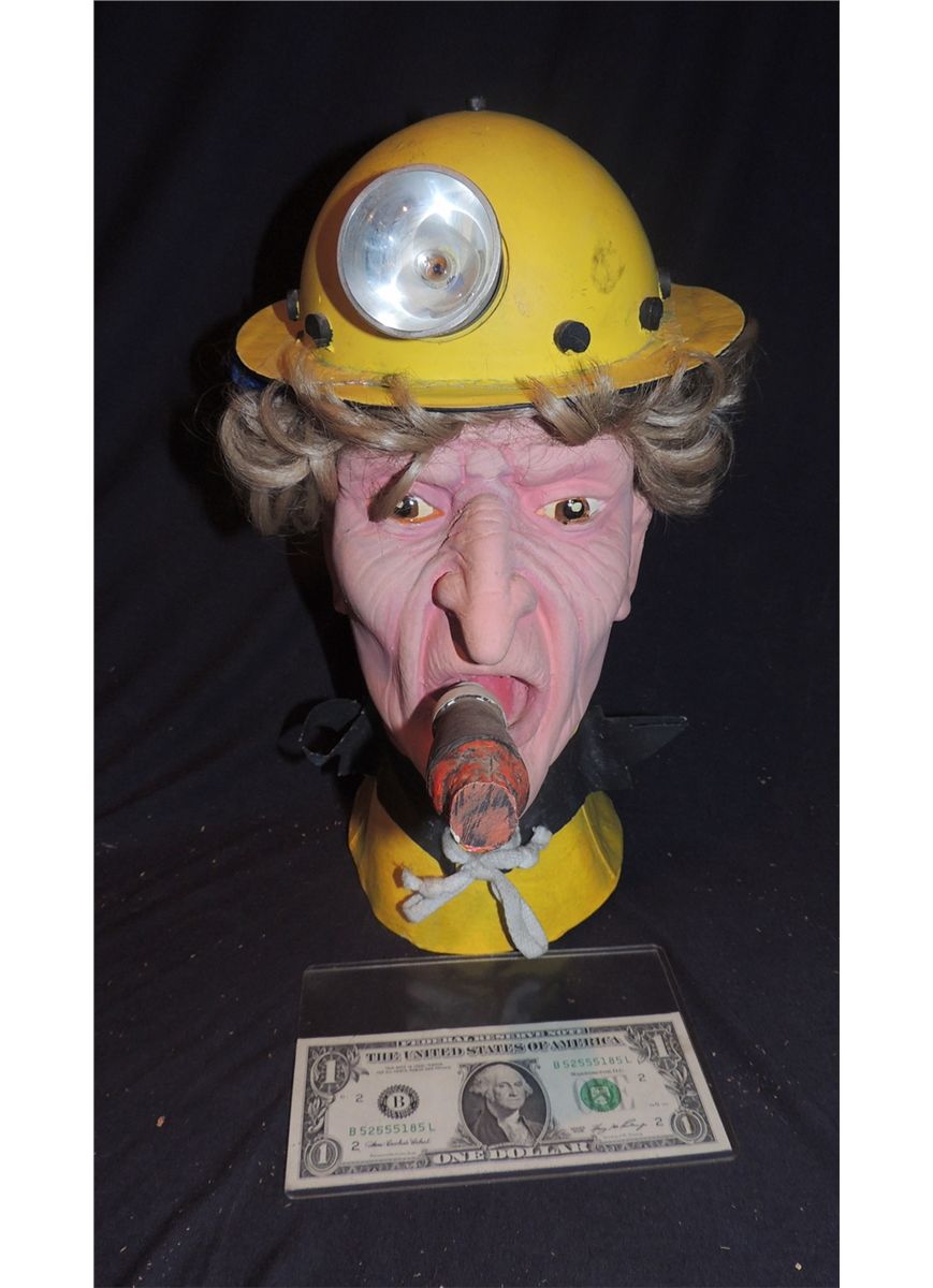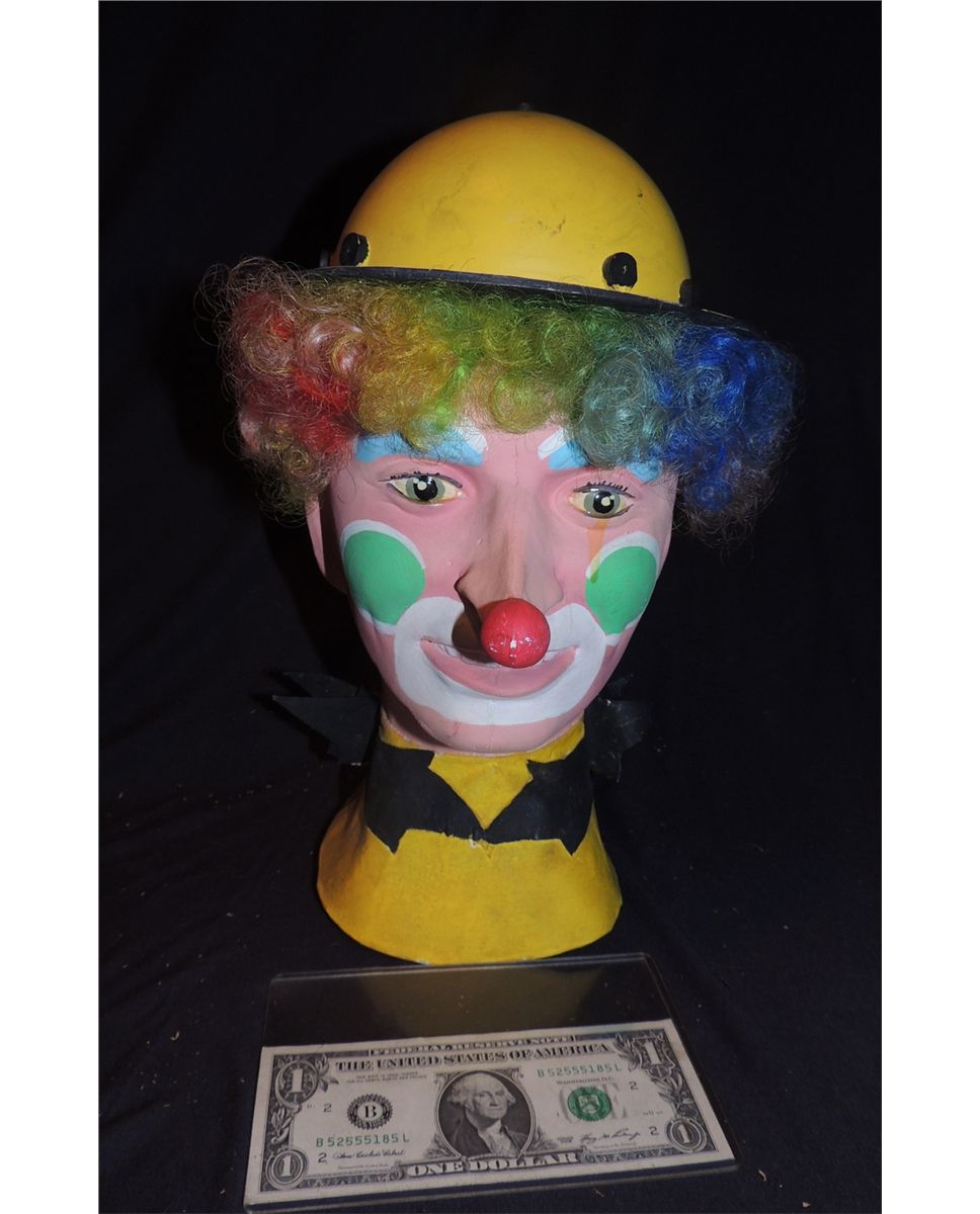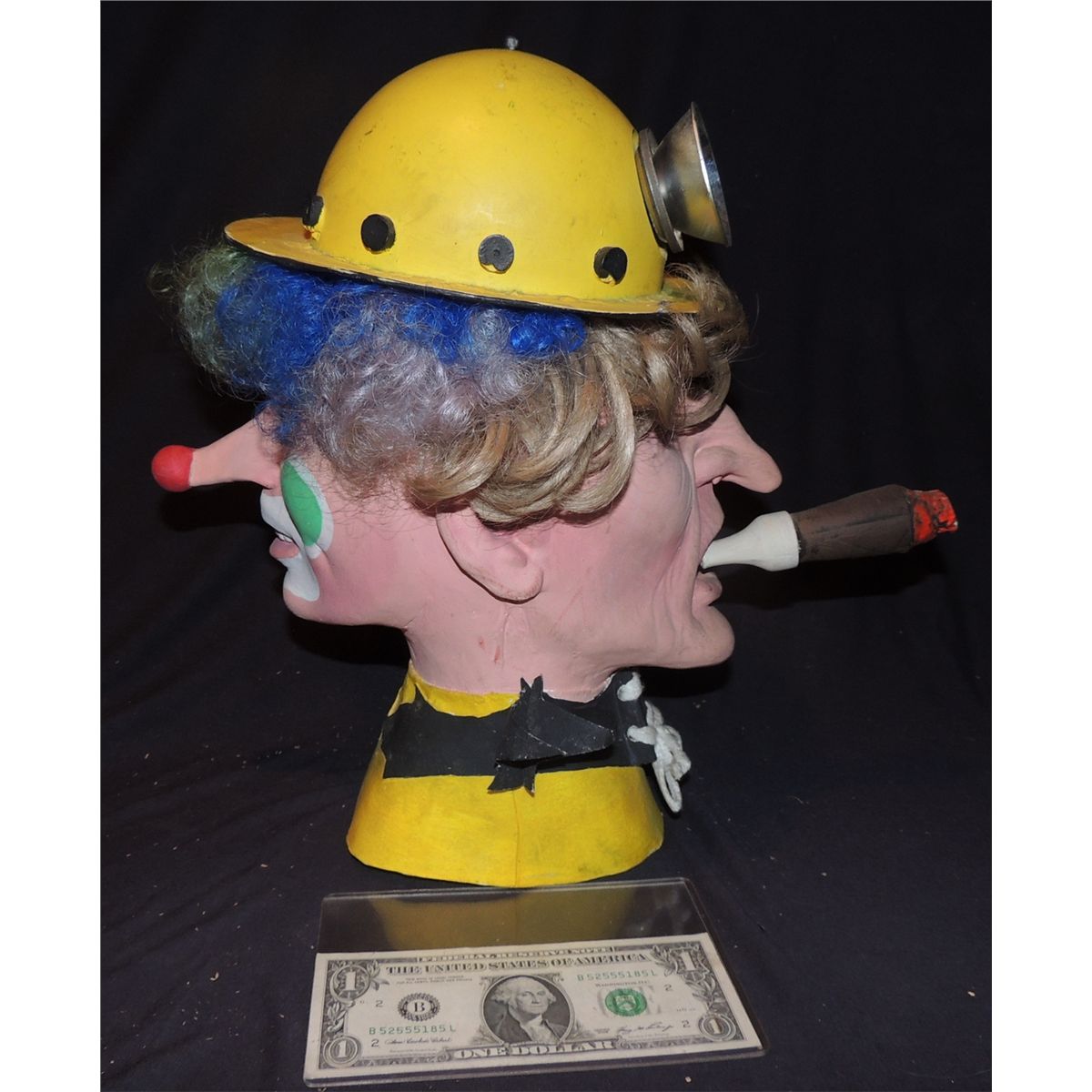 Offered here is a OOAK vintage miner or construction worker with cigar and Circus clown dual face animatronic head. Incredible paint job and detail. Makes a very cool display. Has a mechanical mount underneath so it can spin.
