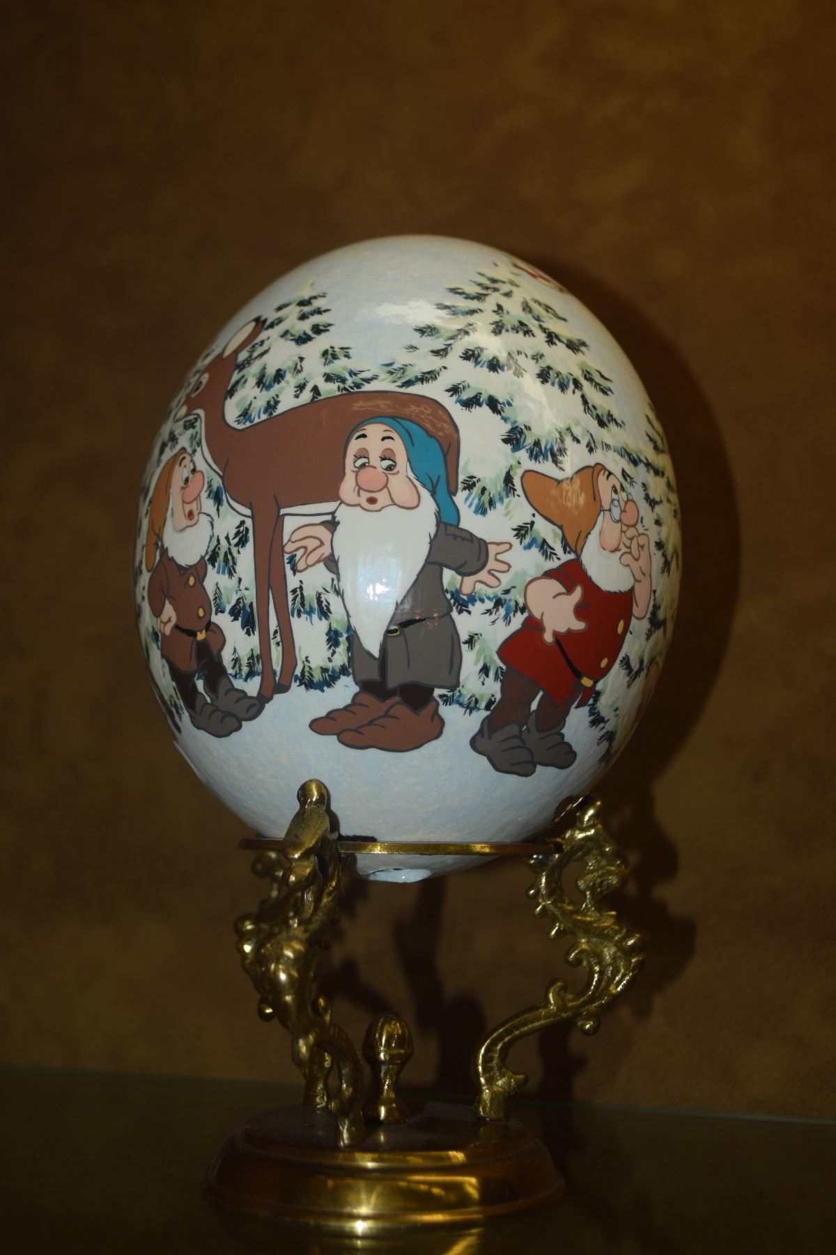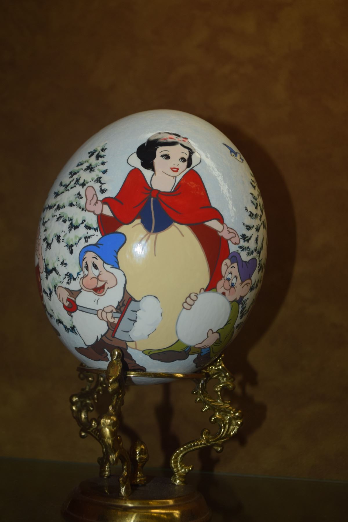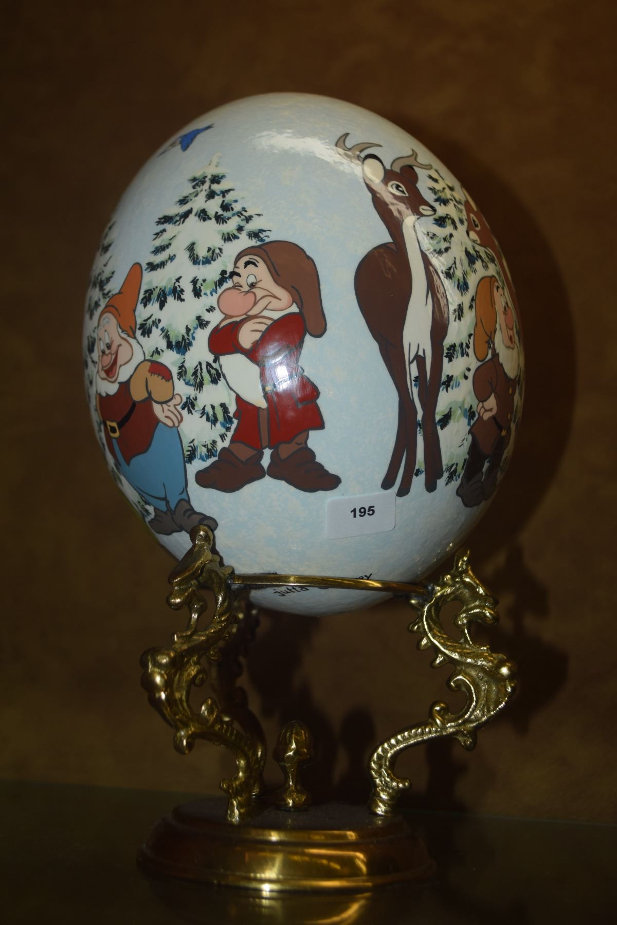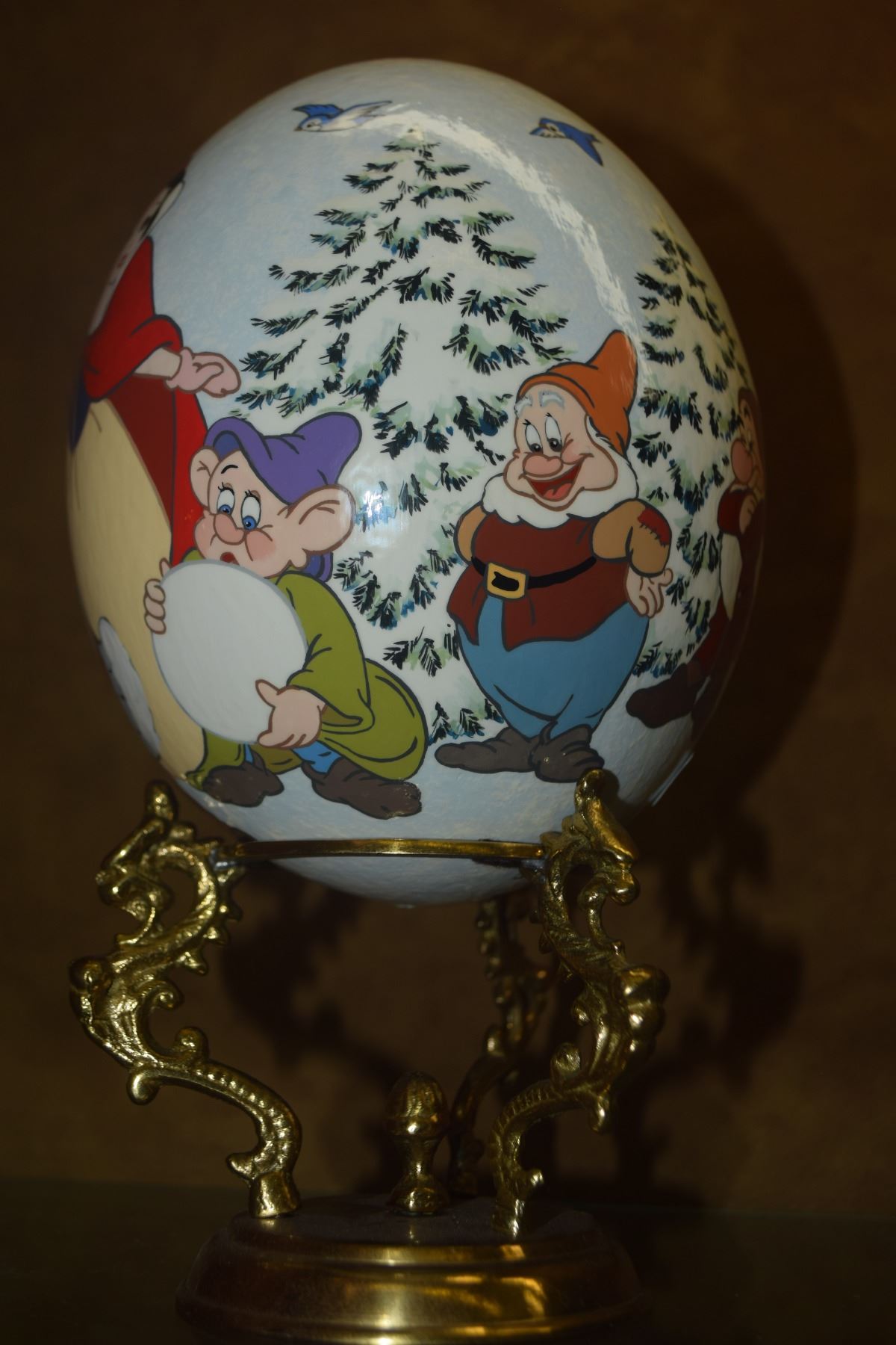 DISNEY OSTRICH EGG HAND PAINTED BY JUTTA, DEPICTING SNOW WHITE & THE SEVEN DWARFS; SIGNED & INSCRIBED JUTTA DISNEY W/BRASS STAND (9 1/2")