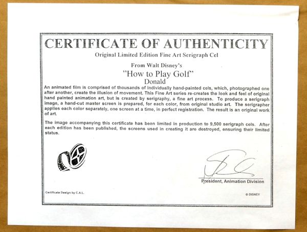 Serigraph Cell ''Donal How To Play Golf'' Rare Museum Framed Ltd. Edition