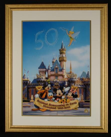 Featured here is a Framed Limited Edition Lithocel Print celebrating the 50th anniversary of Disneyland park. Presented in this litho cel is Mickey Mouse, Minnie Mouse, Donald Duck, Goofy, Pluto, and Tinker Bell. Together they are bringing "The Happiest Homecoming on Earth" to life in front of the amazing Sleeping Beauty Jeweled Castle, dressed in its royal best with jewels, golden accents, and elegant banners. * * Title: "The Happiest Homecoming on Earth" Medium: Giclée Framed Litho Cel Published by: The Animated Animations Company Date of Publication: 2005 Image Size: 17½ X 24½ inches Mat Dimensions: 2¾ inches Framed Size: 26½ X 34 inches Numbered from an edition of 500, LL Condition: Excellent Publisher's Certificate of Authenticity on verso Here's what the Certificate of Authenticity has to say: * * "This litho cel is an interpretive piece of artwork specially created by Disney approved artists and published by The Animated Animations Company. Serigraph Specialty Graphics Group of West Bend, Wisconsin has lithographically printed the character artwork on a premium quality cel." * "The Animated Animations Company under license from Disneyland park has published this limited edition in 2005. It is comprised of a general edition of no more than 500 litho cels numbered 1/500 to 500/500. * This limited edition lithocel would make a great present to all ages!! *