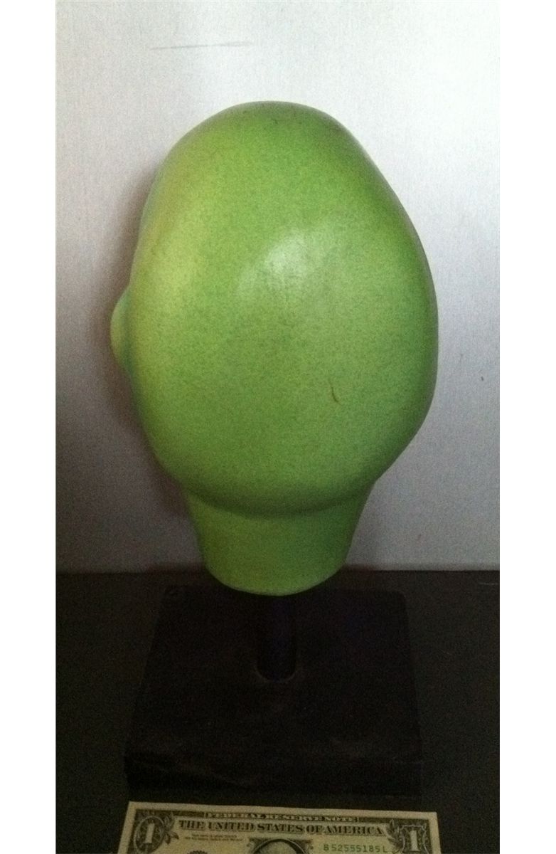 This one has a nice paint job and is made out of fiberglass. Possible materials and paint test? There are 2 threaded shafts in the bottom for mounting but the post was added to display. The stand is attached, and included. Head turns on stand.