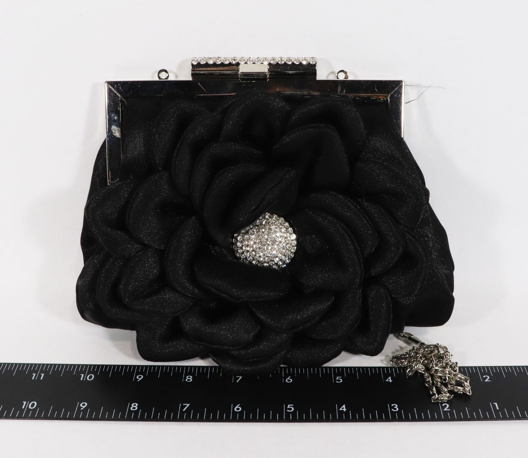 HANDBAG. HAS DETACHABLE WRISTLET METAL HANDBAG CHAIN. HAS RHINESTONE ACCENTS, SOME RHINESTONES ARE MISSING ON CLASP