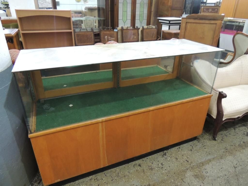 DISPLAY CABINET WITH LAMINATE TOP LARGER DISPLAY. 60X 20X38 AS SHOWN SEE PHOTO FOR MORE DETAILS