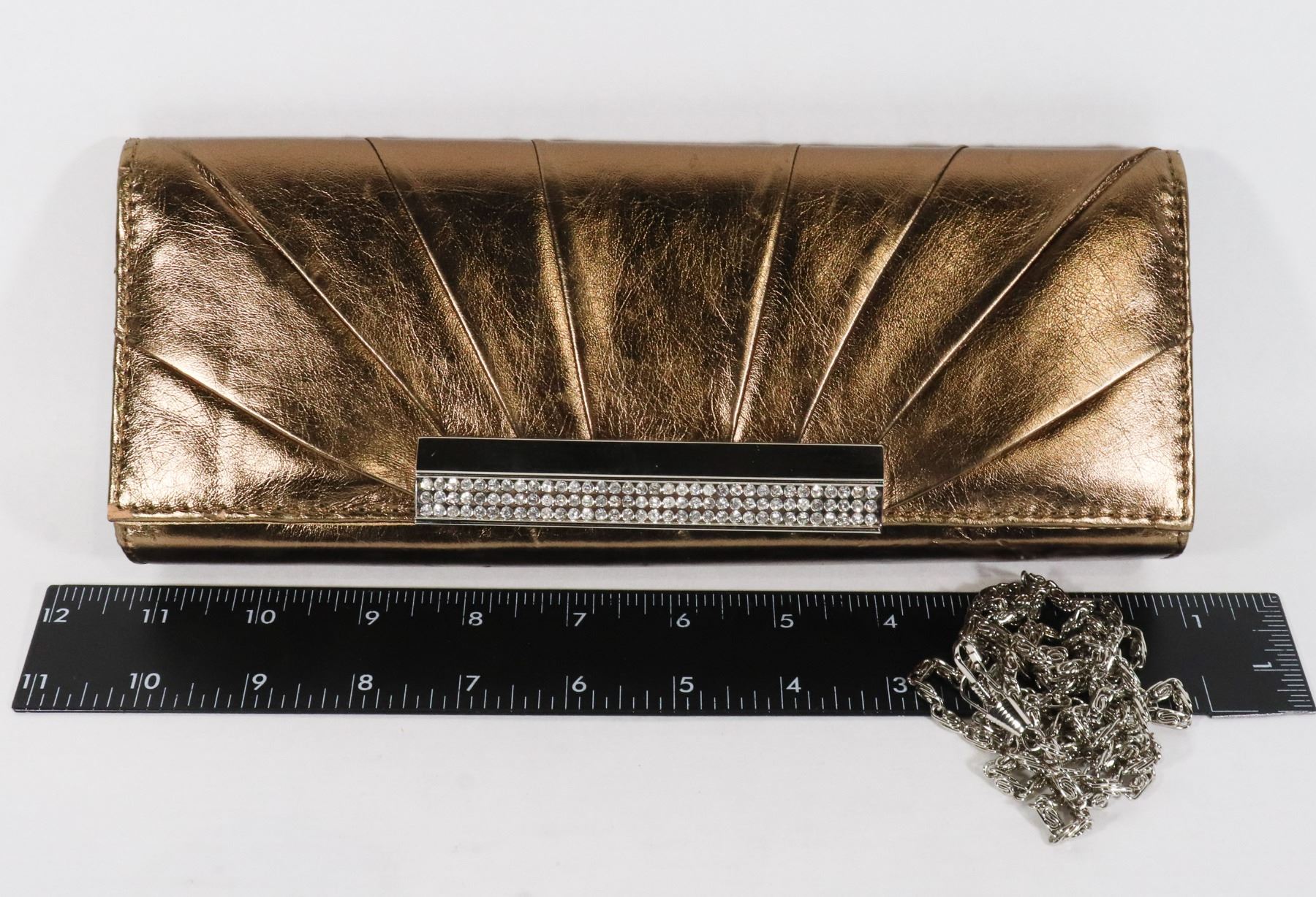 HAS DETACHABLE METAL SHOULDER STRAP. RHINESTONE ACCENT DECORATIVE FRONT PLATE. SOME SCUFF MARKS