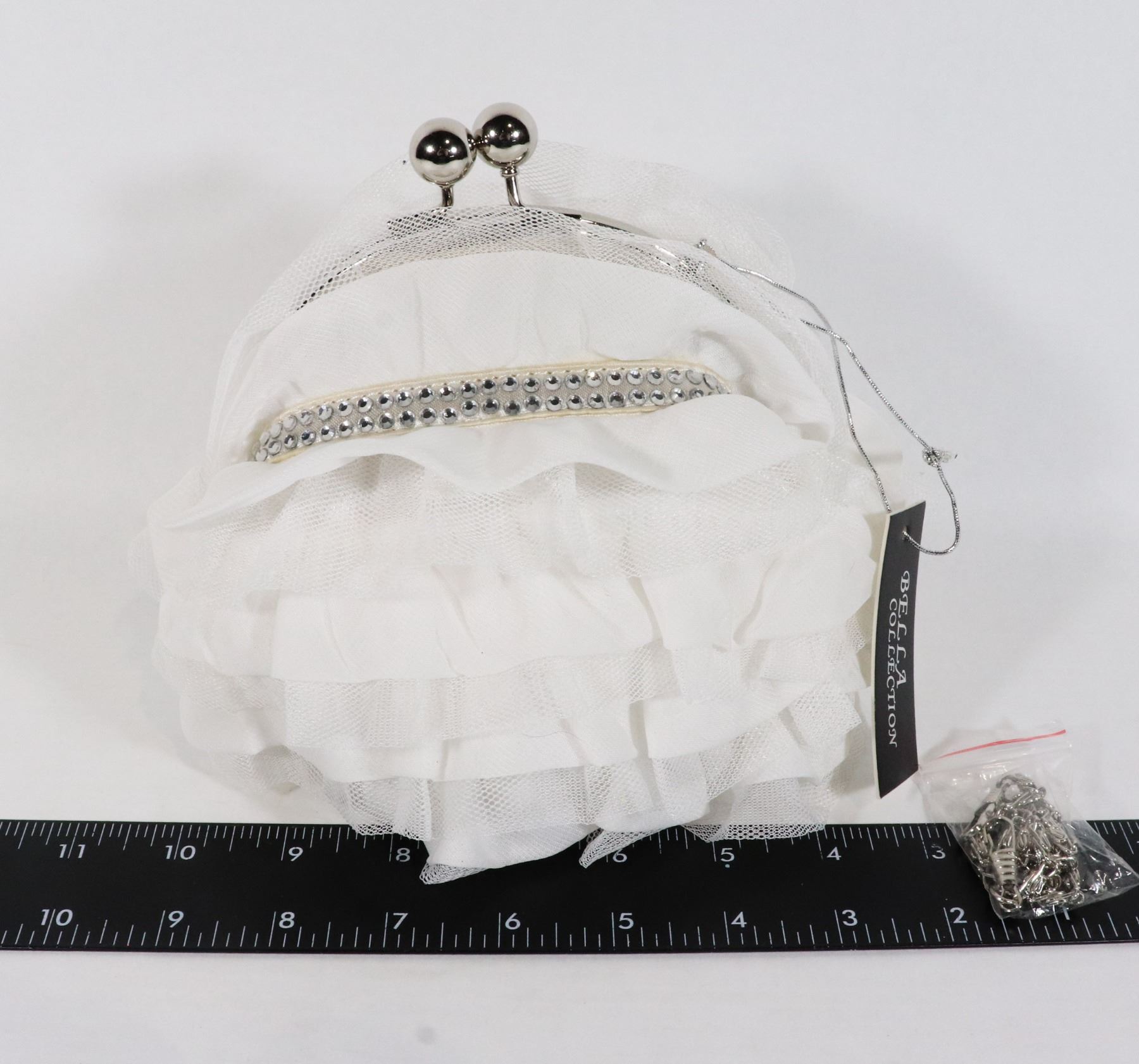 EVENING BAG. HAS DETACHABLE WRISTLET METAL STRAP. RHINESTONE ACCENTS SOME DISCOLORATION