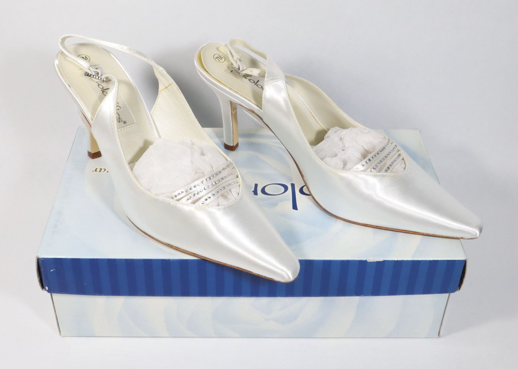 BRIDAL SHOE. SHOE NEEDS SOME REPAIR ON THE GLUE LINE. OTHERWISE LOOK NEW. SOLE PERFECT. LEATHER SOLE. CAN BE DYED.