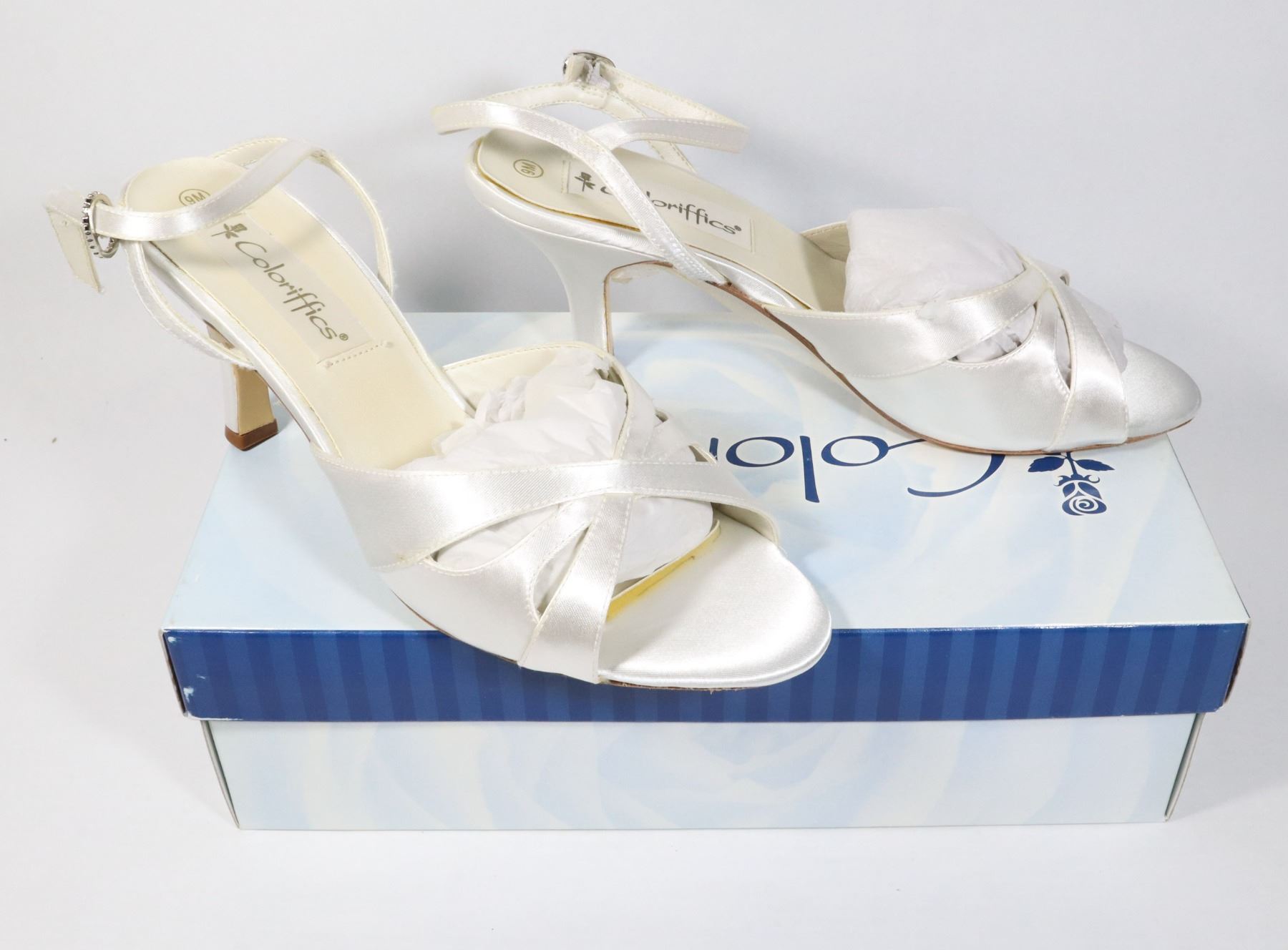 BRIDAL SHOE. SHOE NEEDS SOME REPAIR ON THE GLUE LINE. SOLE PERFECT. LEATHER SOLE. CAN BE DYED.