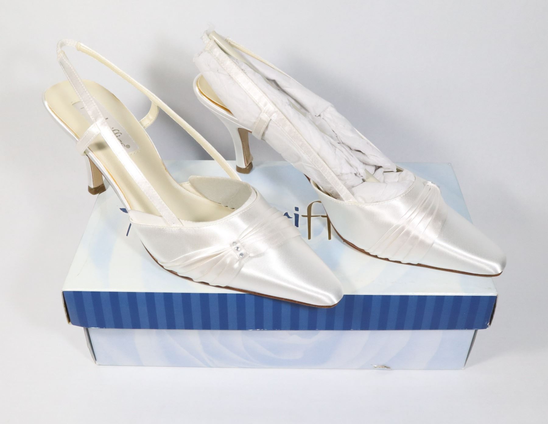 BRIDAL SHOE. SHOE NEEDS SOME REPAIR ON THE GLUE LINE. SOLE PERFECT. LEATHER SOLE. CAN BE DYED