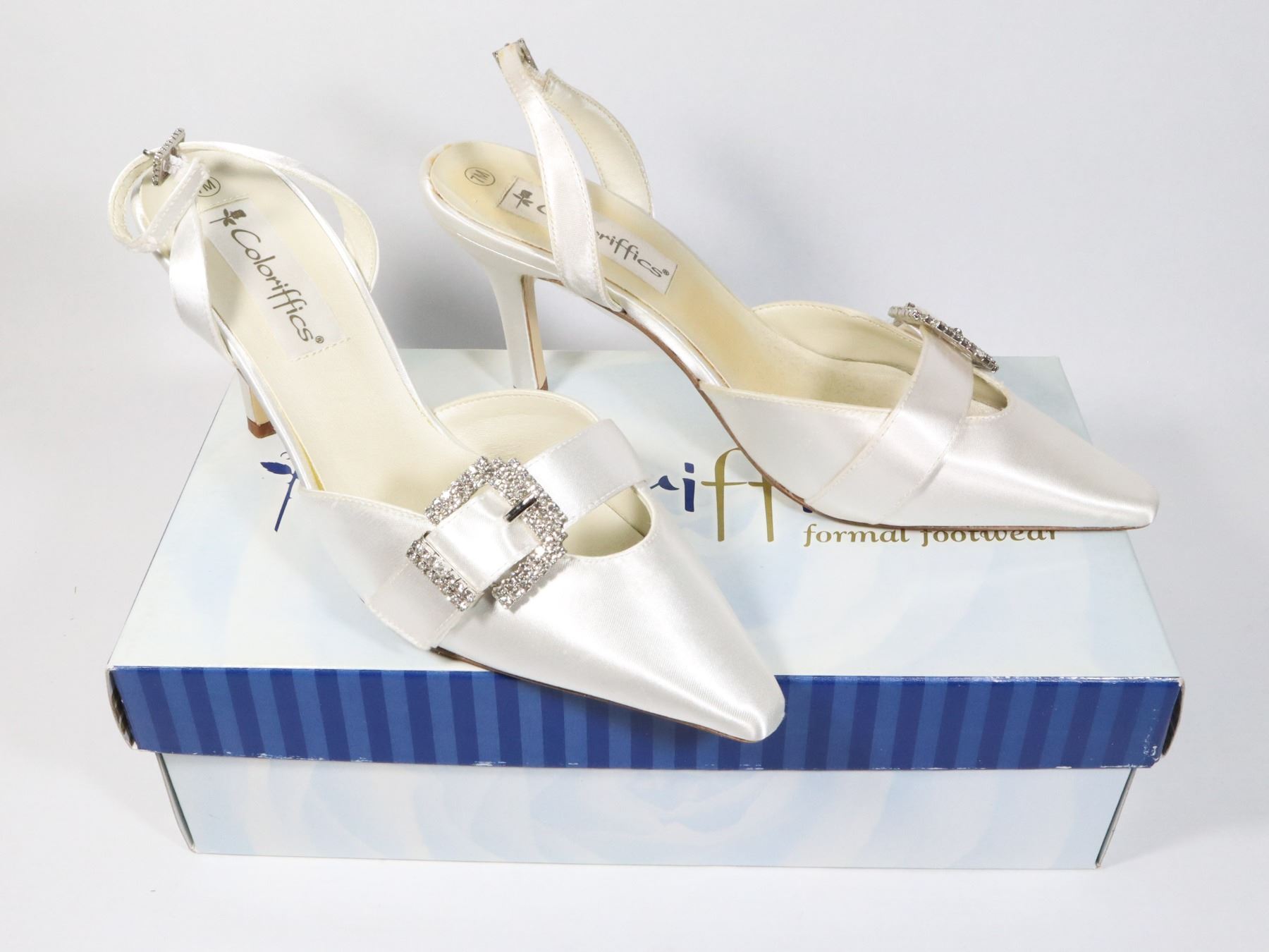 BRIDAL SHOE. SHOE NEEDS SOME REPAIR ON THE GLUE LINE. SOLE PERFECT. LEATHER SOLE. CAN BE DYED