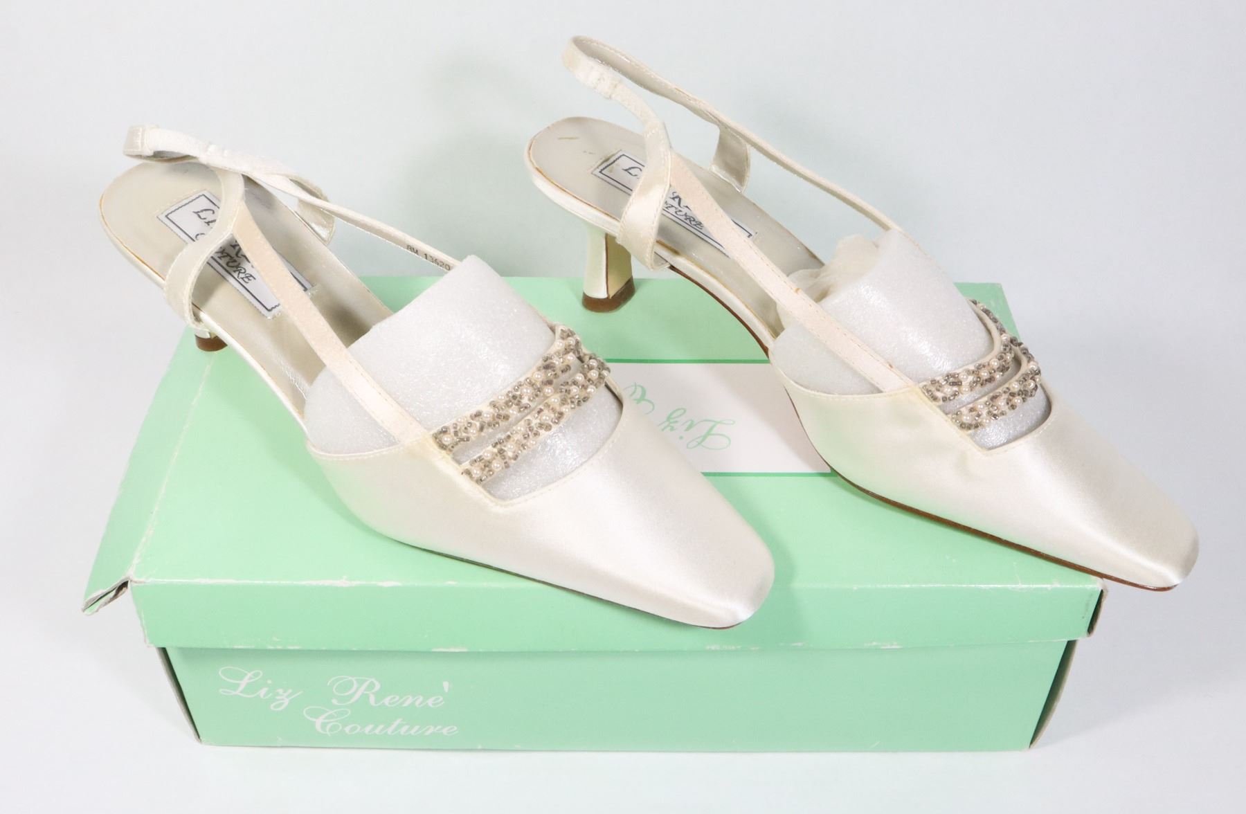 SATIN BRIDAL SHOE NEEDS SOME REPAIR ON GLUE LINE. SOLES PERFECT. FABRIC UPPER, SYNTHETIC LINING, LEATHER SOLE, SIGNATURE