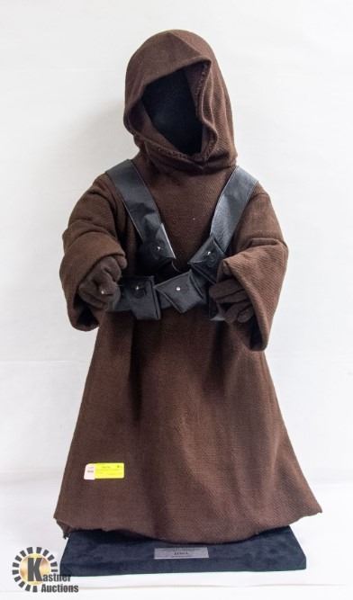SIZE JAWA REPLICA W/ LIGHT UP EYES, REMOTE CONTROL VOICE BOX W/ SEVERAL JAWA SOUNDS, BANDOLIER & WEAPON. STANDS ON PLAQUE W/ STAND *** RARE***