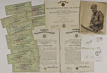 A lot of items by prominent military figures, includes: LYMAN LEMNITZER, 15 signed checks; JAMES H. DOOLITTLE, vintage 8" x 10" sepia image in his cockpit, inscribed at signed, condition just fair; BROOKE ALLEN and HAROLD BROWN, a printed D.S. awarding a commendation medal, 1965, signed by both; JOHN W. VESSEY, JR., signature on a postal cover, 1986; JAMES D. WATKINS, signature on a postal cover, 1986; WILBUR M. BRUCKER and R. V. LEE, printed D.S. appointing a First Lieutenant, signed by both,1956, mounted, along with a similar document from 1959. Very good.