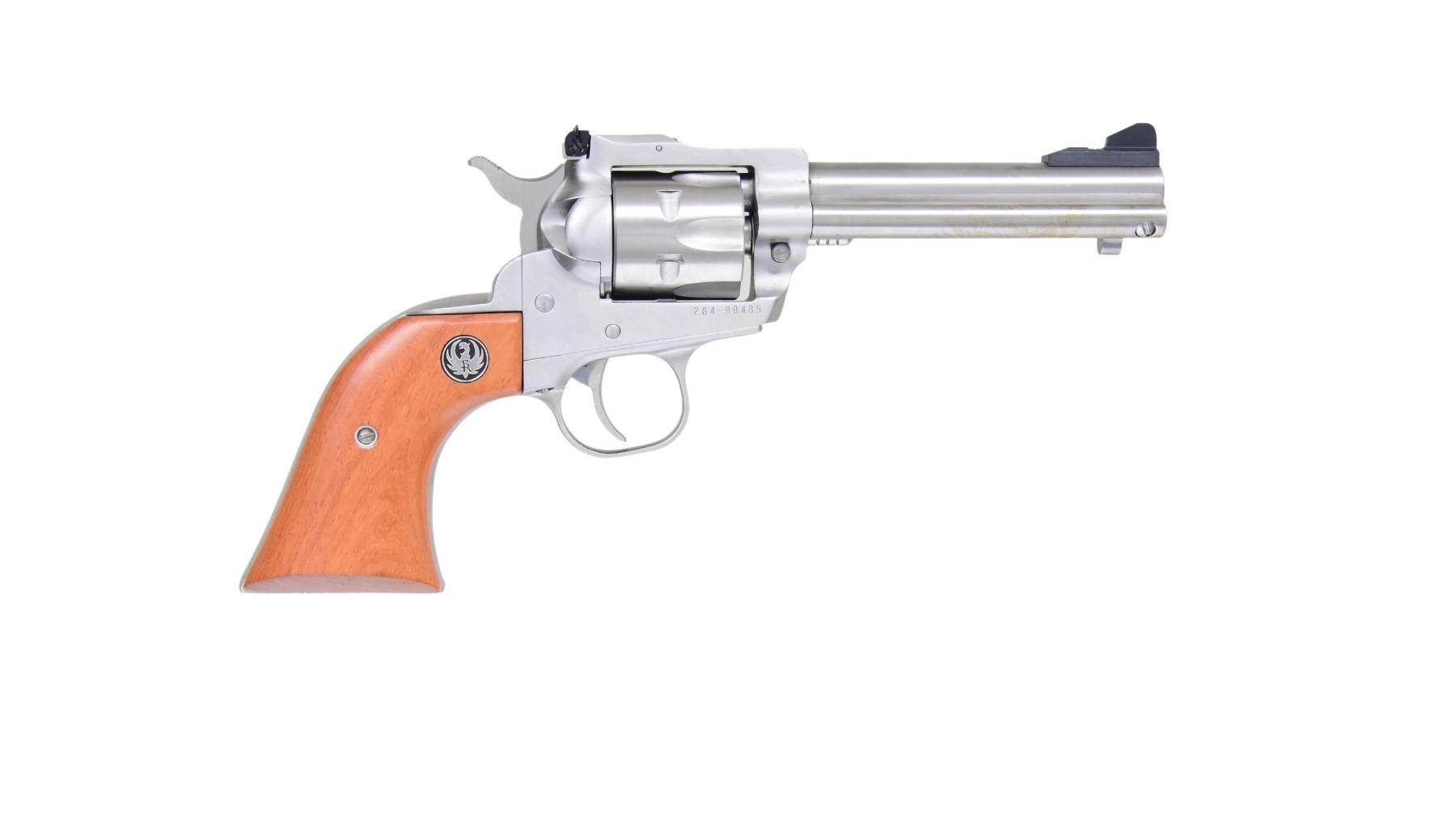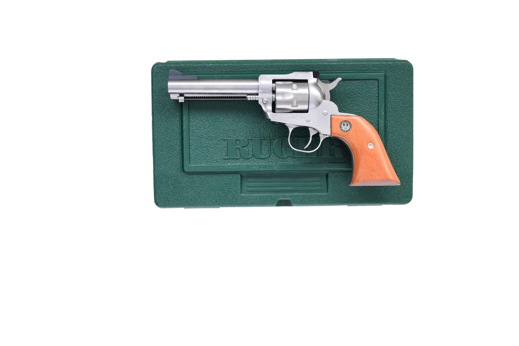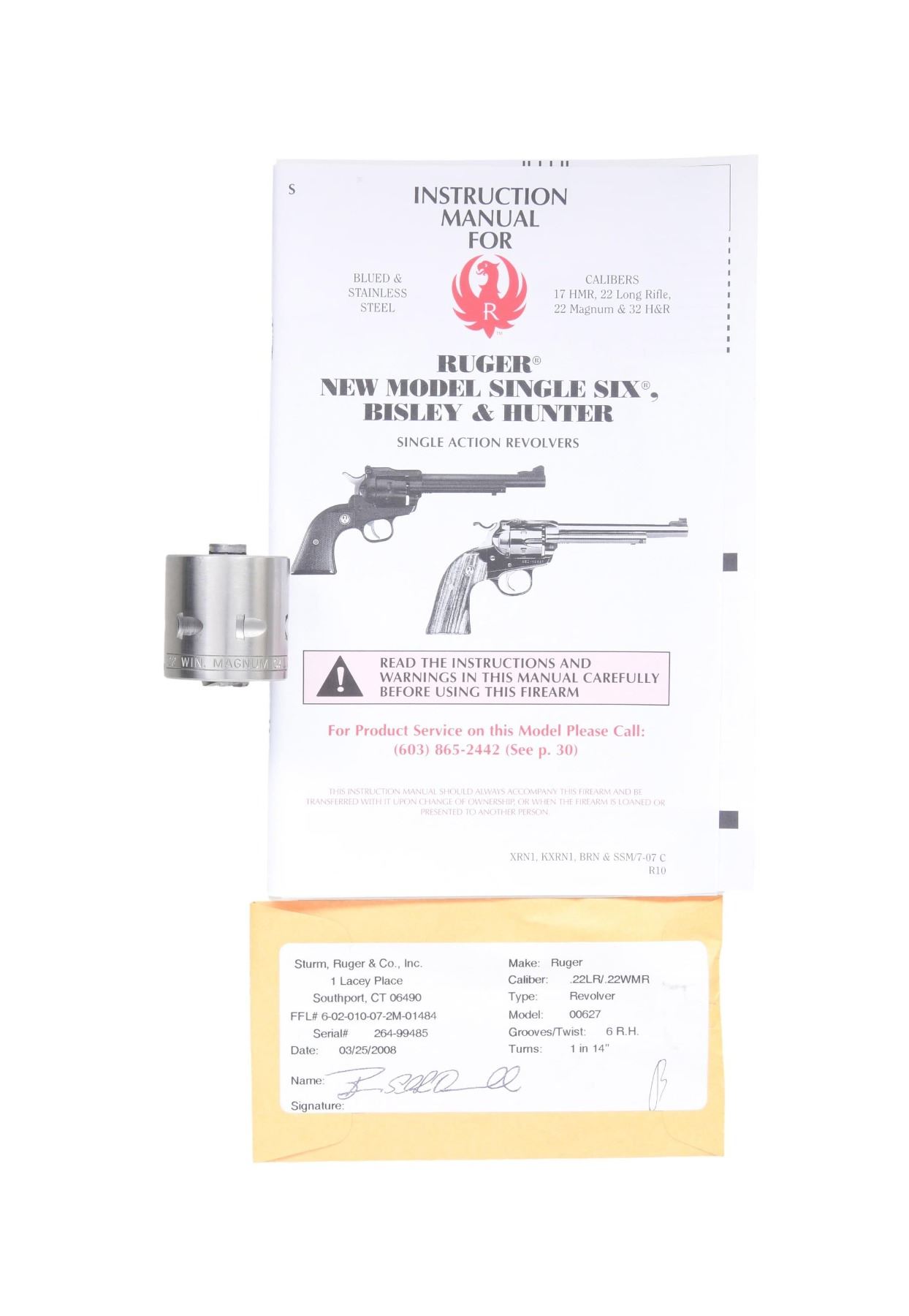 STAINLESS CONVERTIBLE SA REVOLVER WITH MATCHING FACTORY BOX. Cal. 22 LR / 22 Mag. S# 264-99485. Mfg. March 2008 as Model 00627 / Catalog No. KNR4. Bbl. 5.5". Fixed ramp front sight. Matching numbered 6 shot. Smooth wooden grips. UNATTACHED ACCESSORIES: Factory box, extra cylinder, and instruction manual. CONDITION: near excellent overall condition w/ dried storage grease on right side. Front sight screw drilled through barrel into rifling; balance of rifling near excellent. (25-9739/MD) MODERN. $400-600.