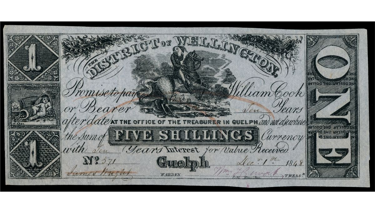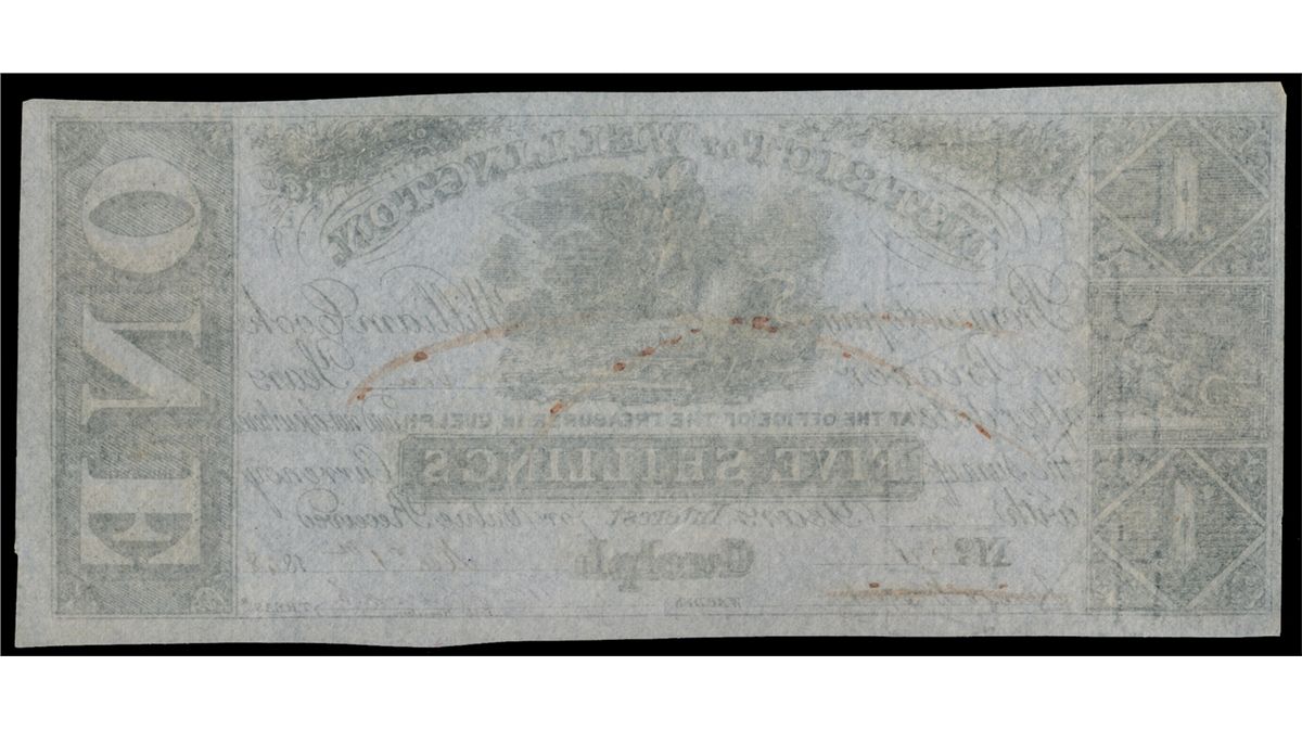 DISTRICT OF WELLINGTON. 5 Shillings ($1.00). Dec. 1, 1848. MU-6. No. 571. AU. Ex. TICF Sept. 29-30, 2006 auction.
