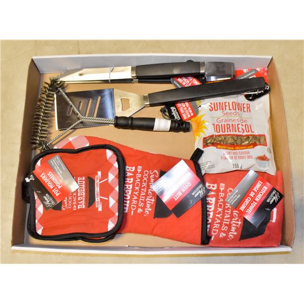 NEW BBQ SET, TONGS, SPATULA, CLEANER, HOT PADS, MI