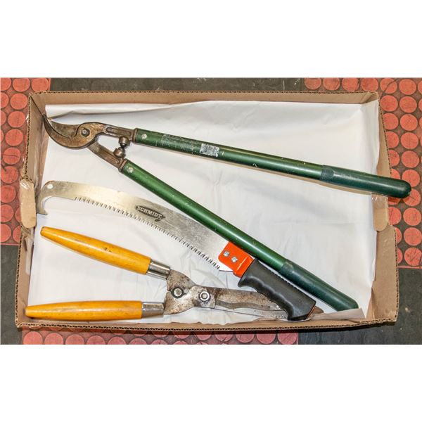 TOOLS INCL. SCHMIDT 21"-PROFESSIONAL PRUNING SAW, 26"-TREE BRANCH LOPPER AND WESTON WOOD HANDLE SHRUB TRIMMERS