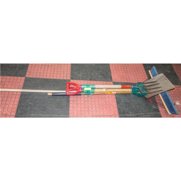 HANDLE SHOP BROOM, SQUARE SHOVEL, 4 TINE PITCHFORK, AND LEAF RAKE