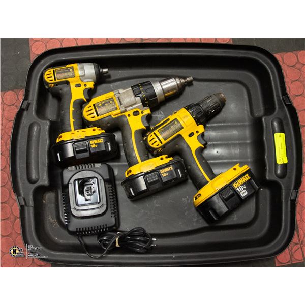 THREE 18 VOLT DEWALT DRILLS W/BATTERIES & CHARGER