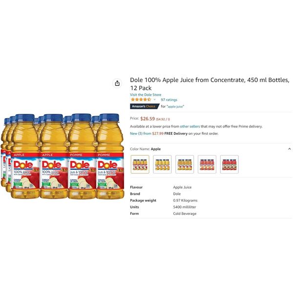 DOLE 100% APPLE JUICE FROM CONCENTRATE 450ML