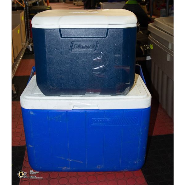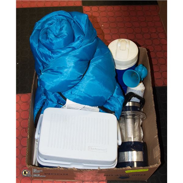 SLEEPING BAG, LARGE LED CAMP LIGHT WITH HANDLE, RUBBERMAID HINGED LID COOLER WITH CARRY HANDLE, COMPRESSED AIR SIGNAL HORN, IGLOO WATER COOLER, LED