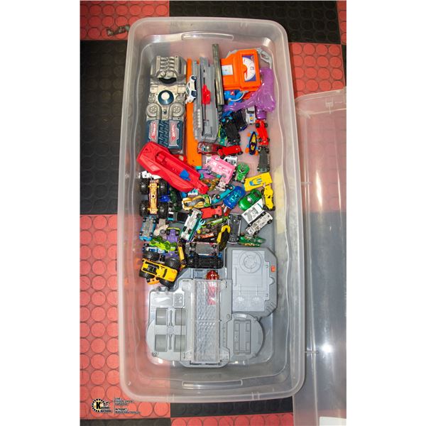 CLEAR STORAGE TOTE FULL OF HOTWHEEL CARS