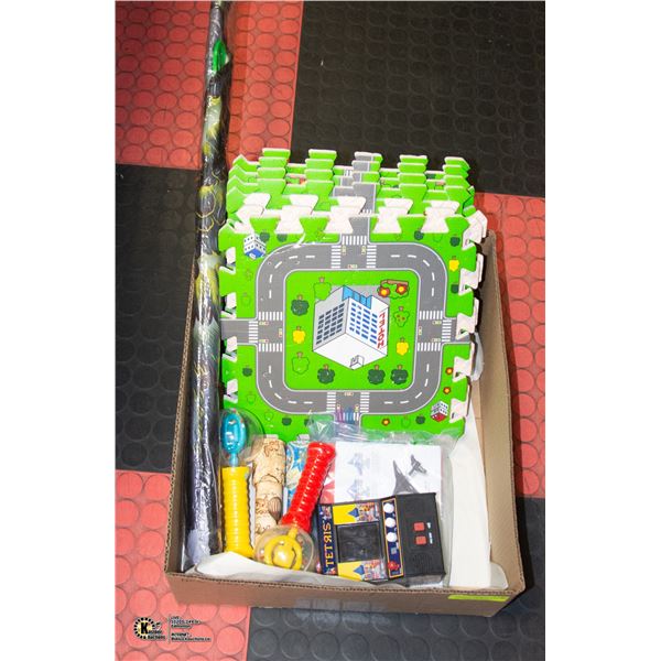 INCL. 7 FOAM INTERLOCKING FLOOR "ROAD MAP", NEW KITE, VINTAGE TETRIS GAME (WORKING), PAPER AIRPLANE PATTERN SETS, TWO VINTAGE KALEIDOSCO...