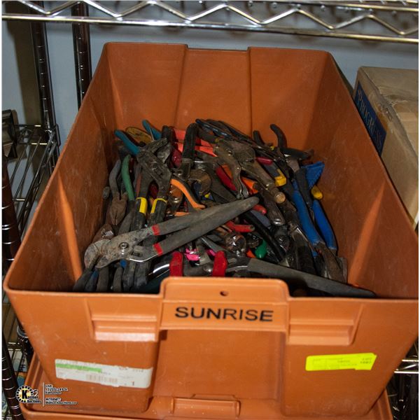 TOTE OF ASSORTED PLIERS, CUTTERS, SNIPS
