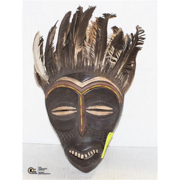 FIERCE LOOKING WOOD MASK WITH HEADDRESS FEATHERS